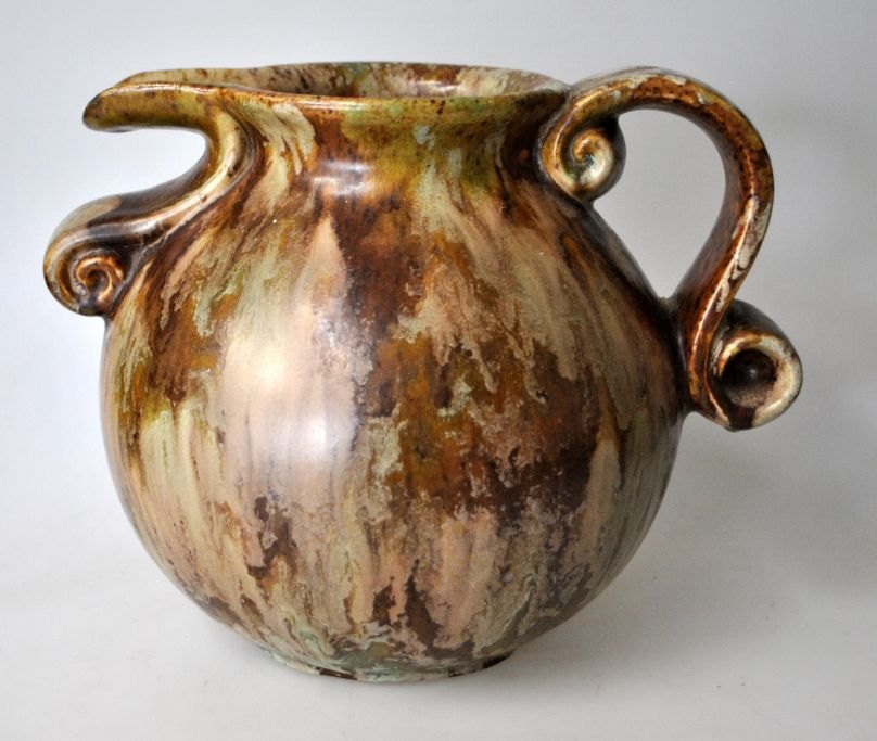 Michael Andersen & Søn kande, 20. årh. Bornholm, Danmark. Spraglet glasur i grønt og brunt. Signeret. H.: 16 cm.