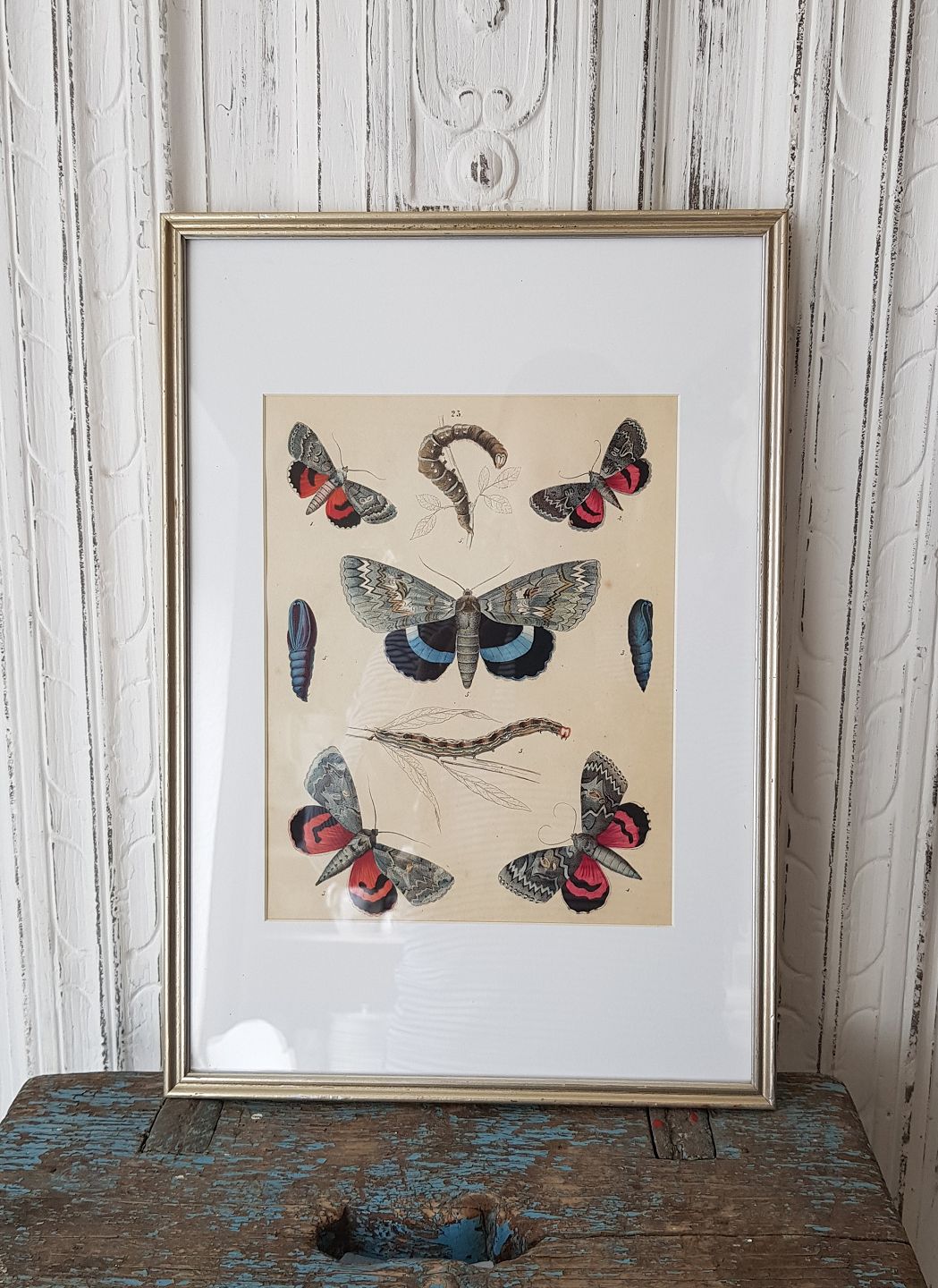 1800s hand-colored print with butterflies in a beautiful silver frame.
