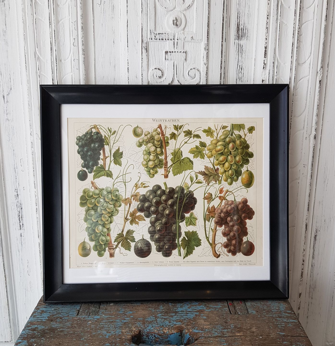1800tals håndkoloreret tryk med vindruer i gammel sortlakeret ramme