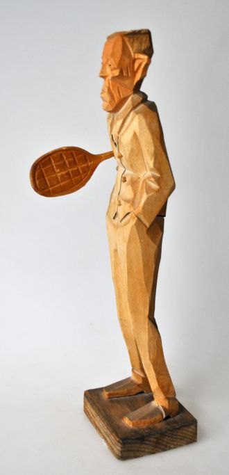 Svensk skåret træfigur af den svenske konge Gustav VI Adolf (1882 - 1973), Sverige. Stående med en tennis ketsjer. Signeret: A. Gis.... 1946. Højde.: 25 cm.