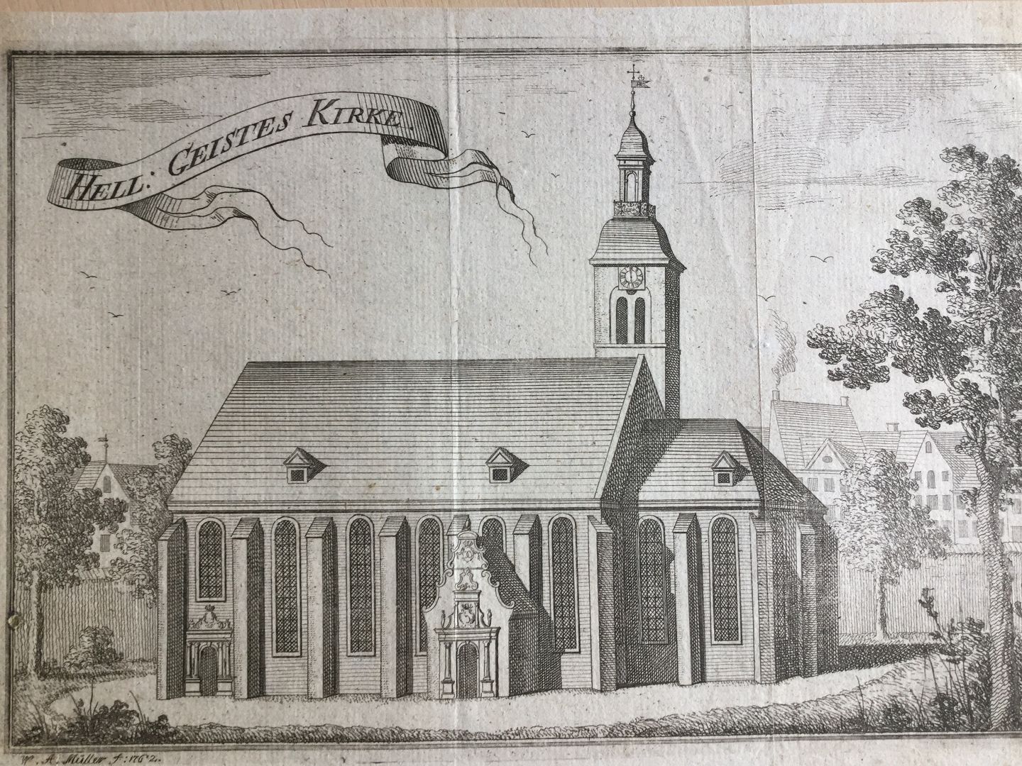 Nuværende bygning blev opført 1730-32. Oprindelig hed kirken Helliggeist (Hellig gæst), men fra 1881 Helligåndskirken.