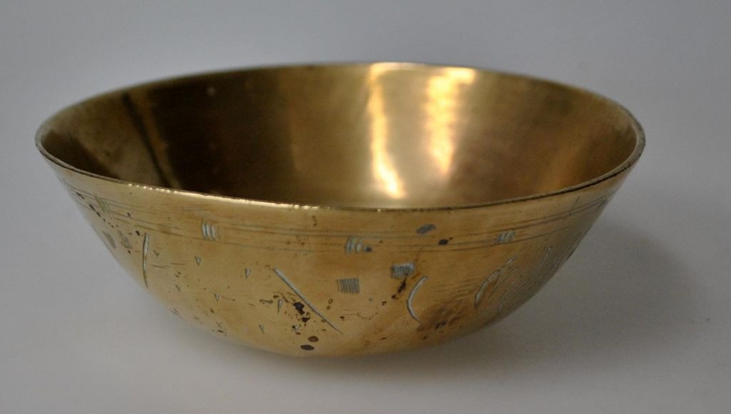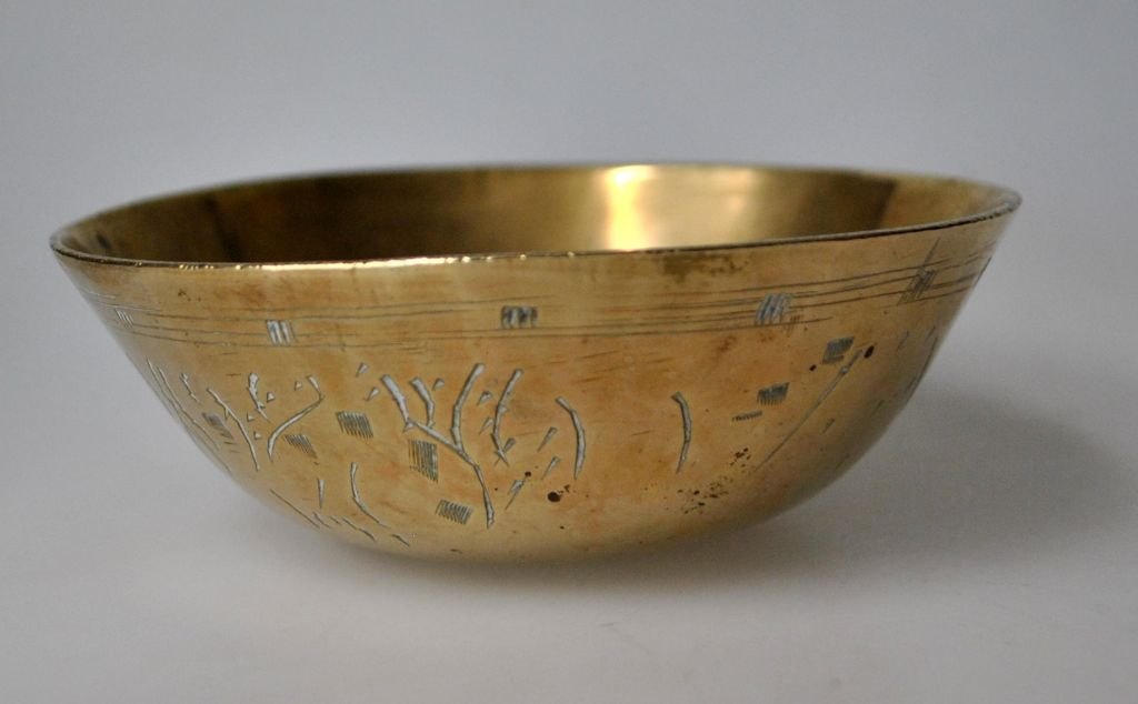 Kinesisk messing skål, 20. årh. Med dekoration på siderne. Stemplet. H.: 4 cm. Dia.: 11 cm.