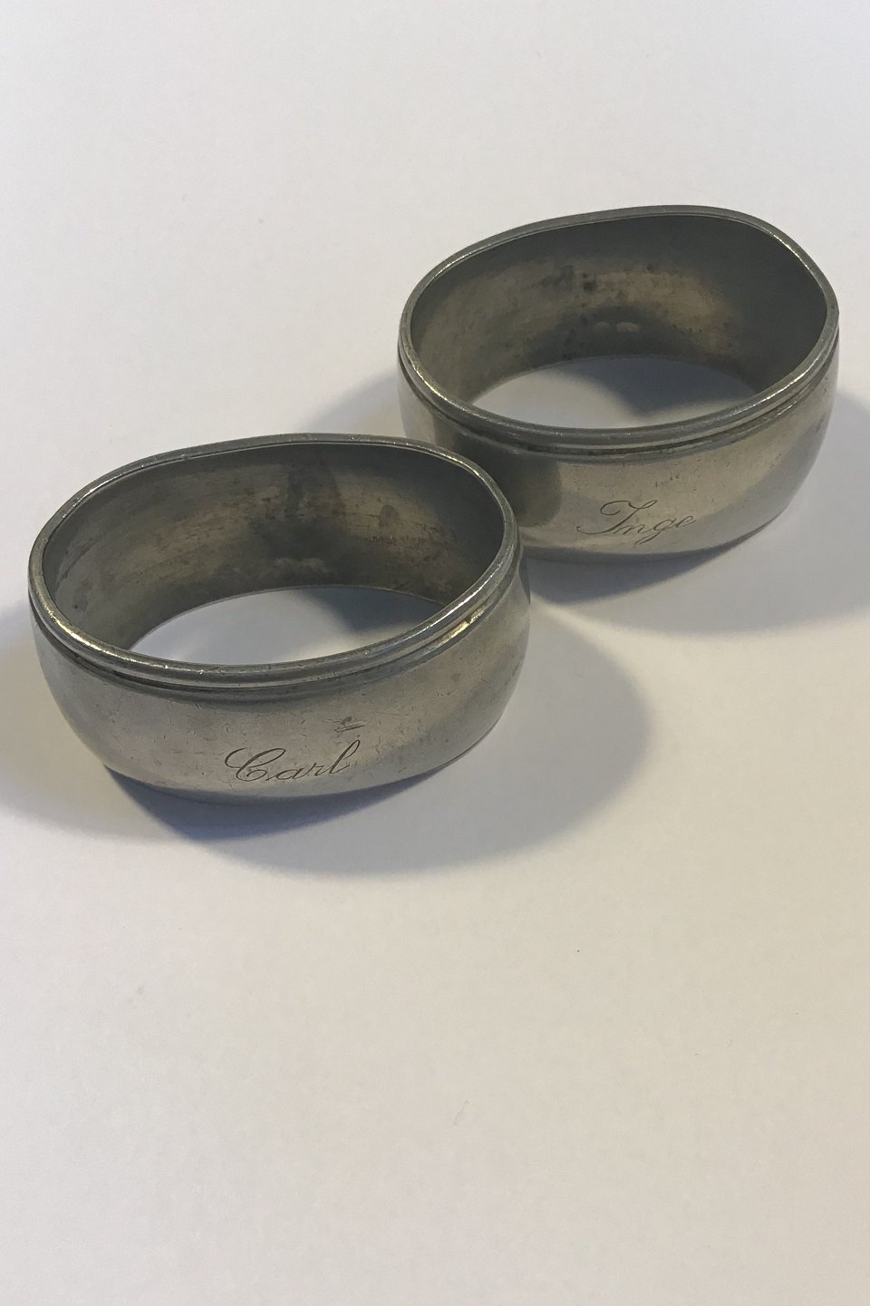 Kay Bojesen Pewter Napkin Rings No. 125. Measures 6 cm x 4.5 cm / 2.26 in. x 1.77 in. (Engraved respectively Inge and Carl)
