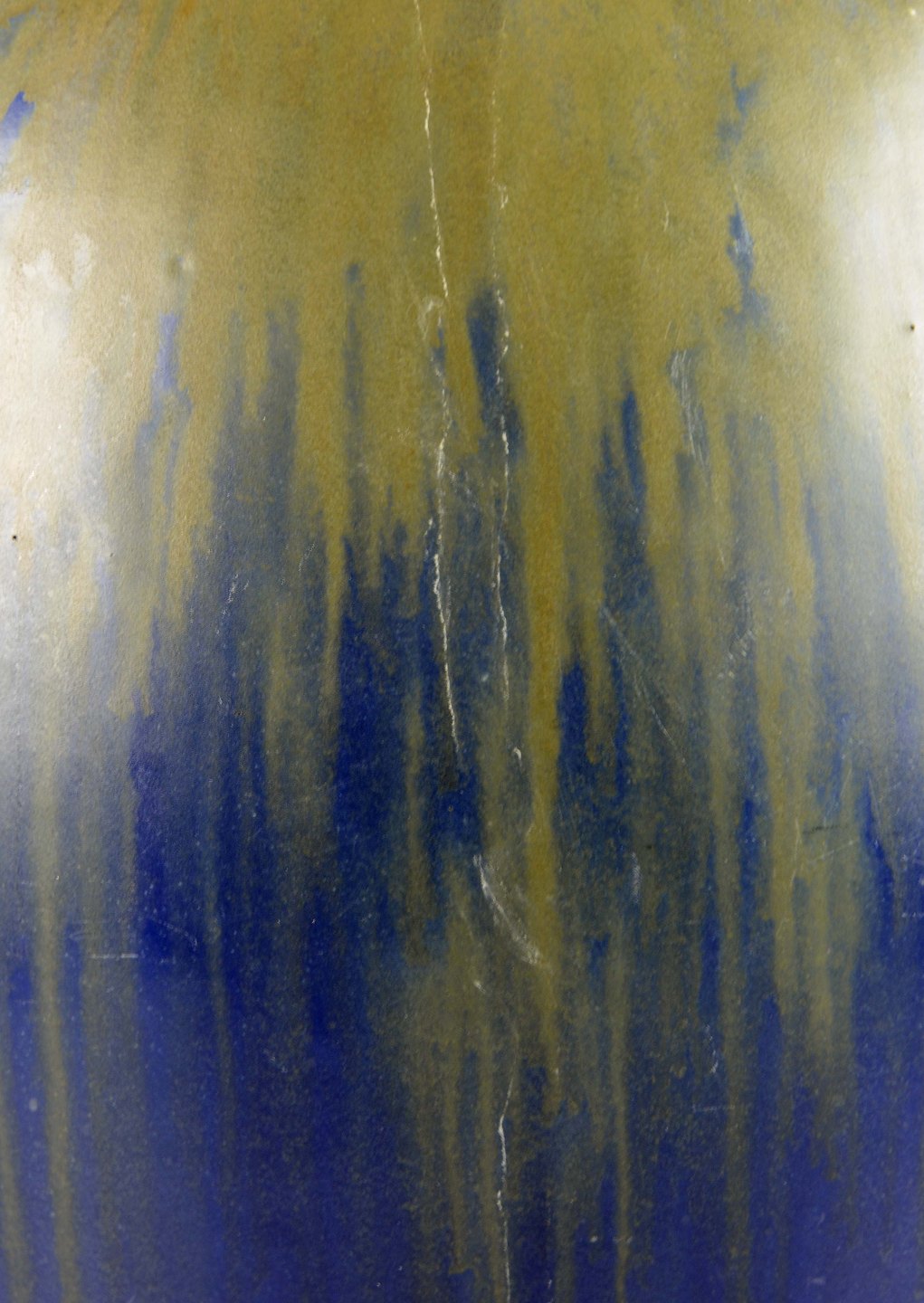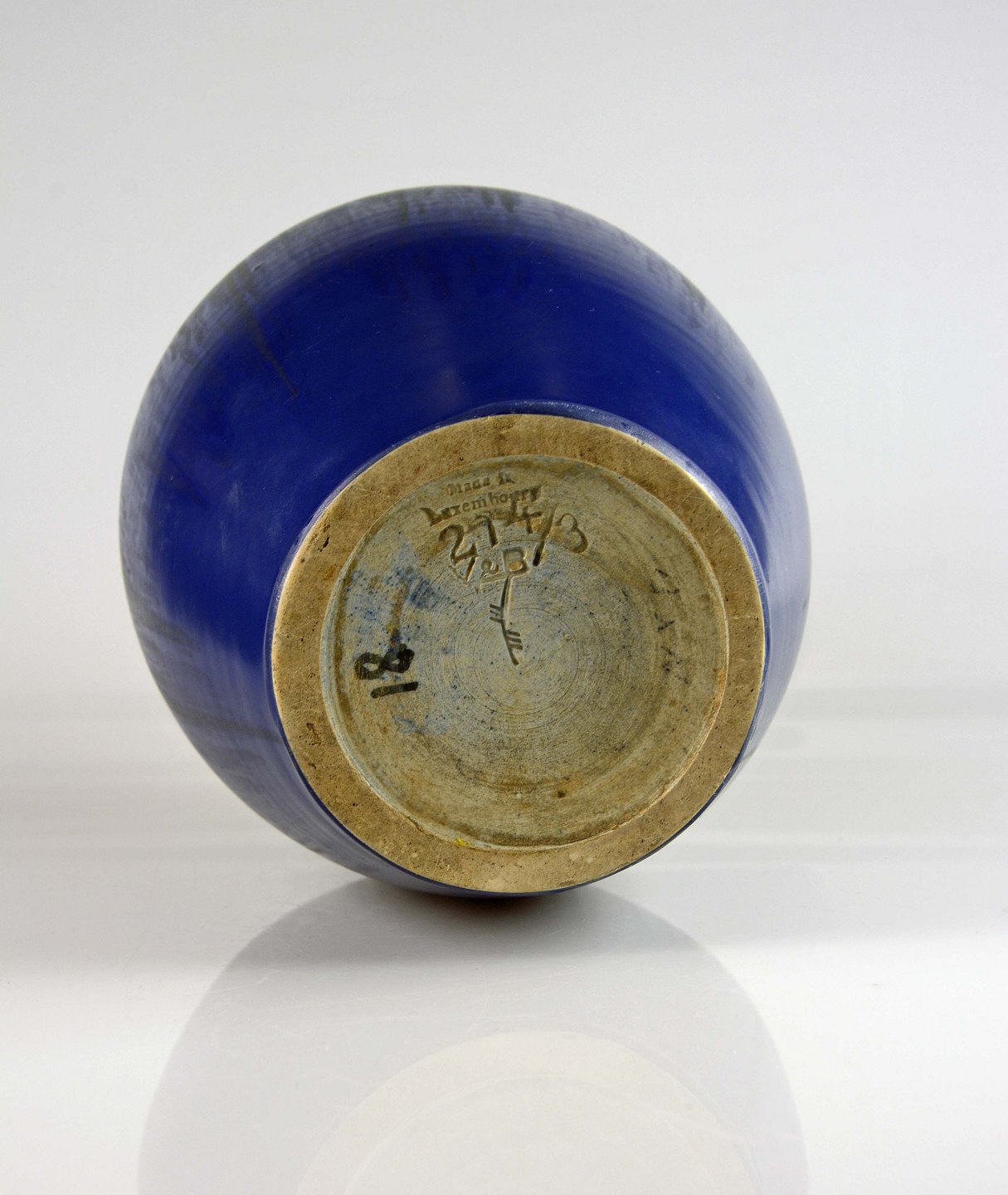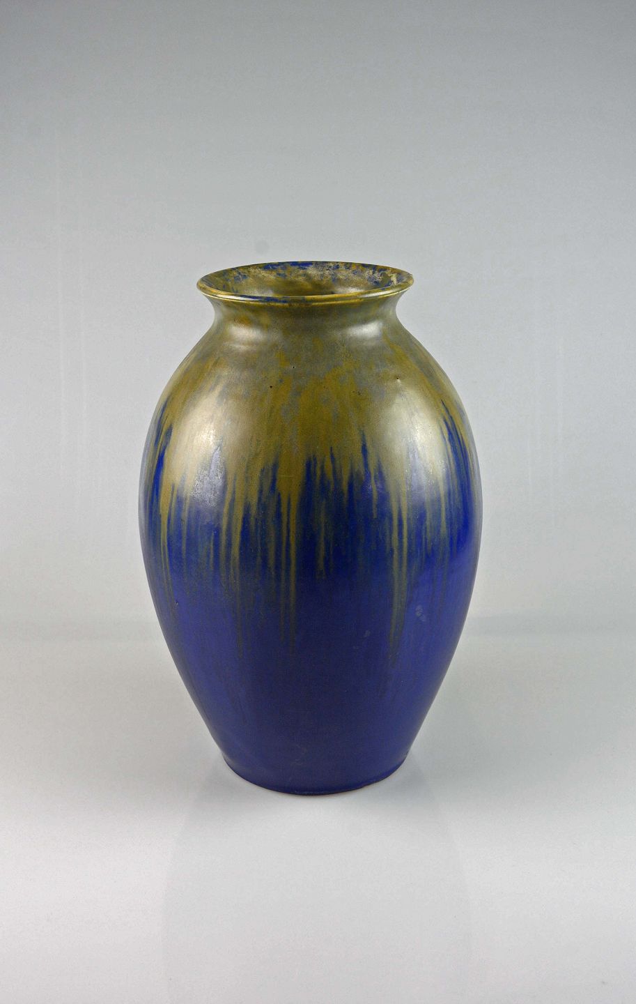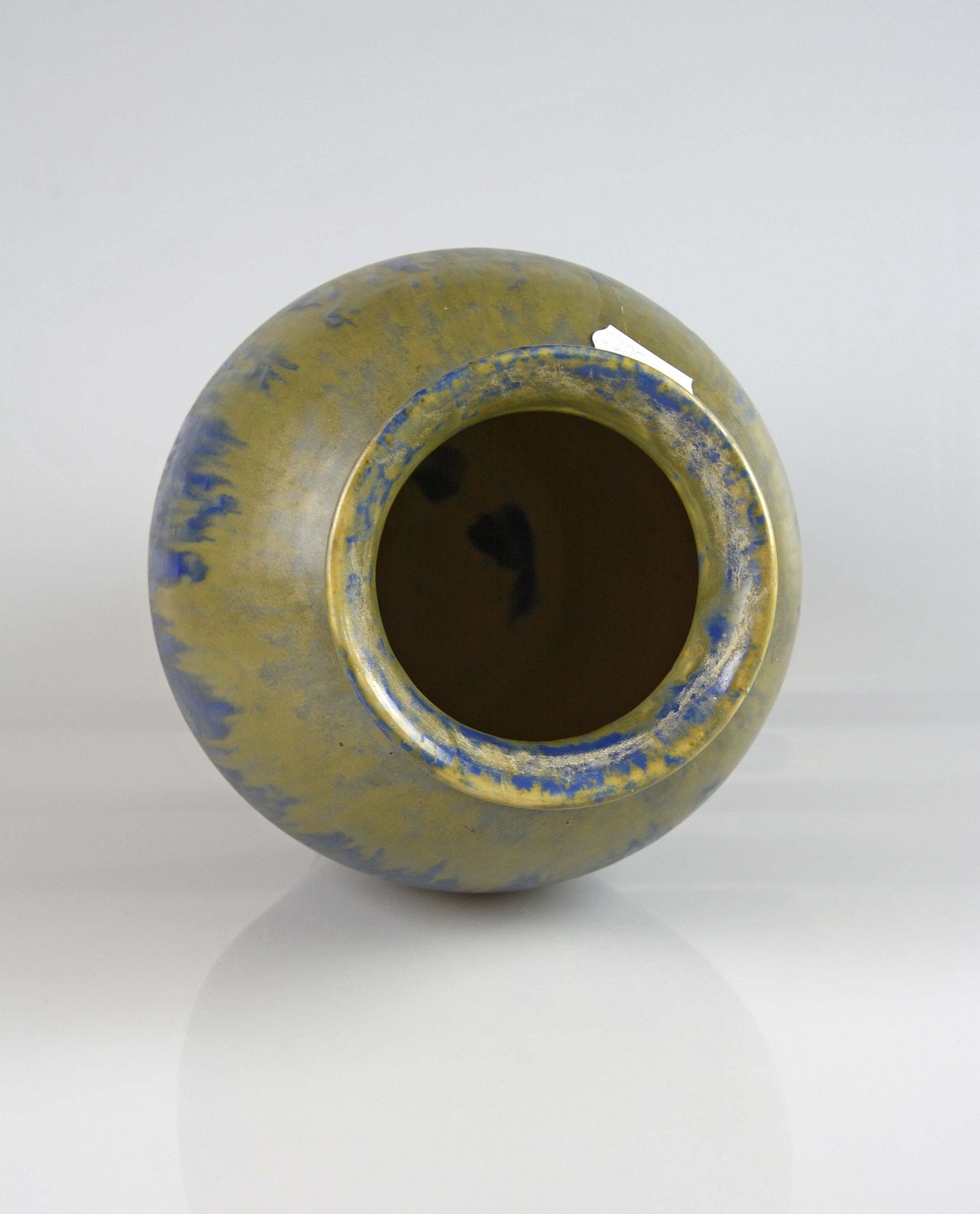 Vase i keramik med glasur i grøn og blå nuancer, signering svært at læse formentlig fra Luxenborg.