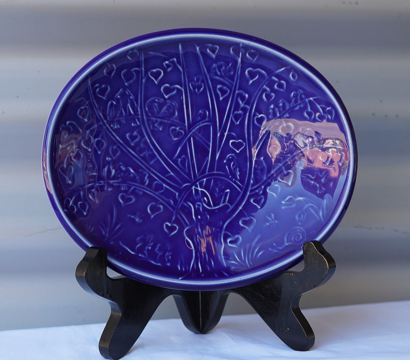 Rundt fad, blåt, med livets træ fyldt med hjerter og smådyr