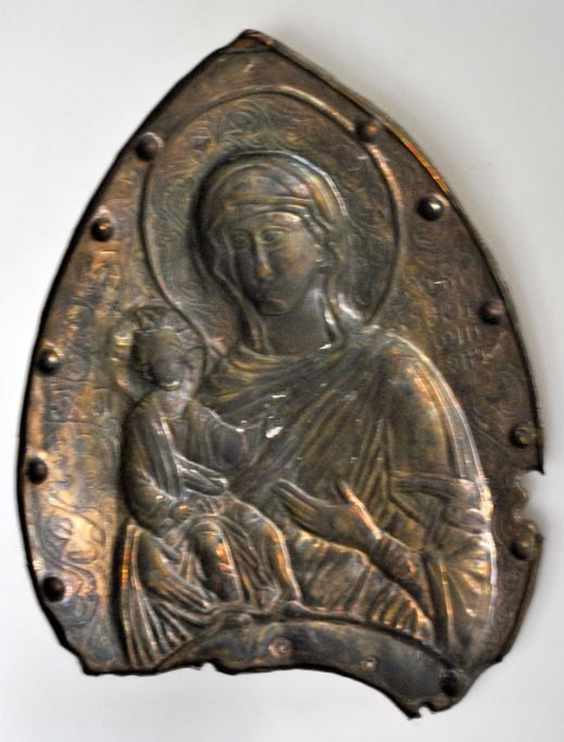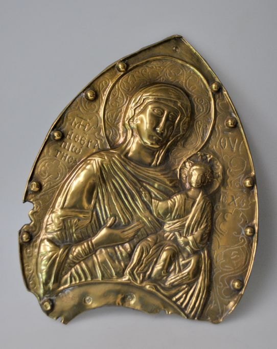 Greek icon in brass, 19th century Godmother Hodigitria. Signed. With engravings. Has previously been silvered. 28 x 20.5 cm. Hodigitria means the signpost and guide. Mother of God raises the right hand to show the way, guide to the child.