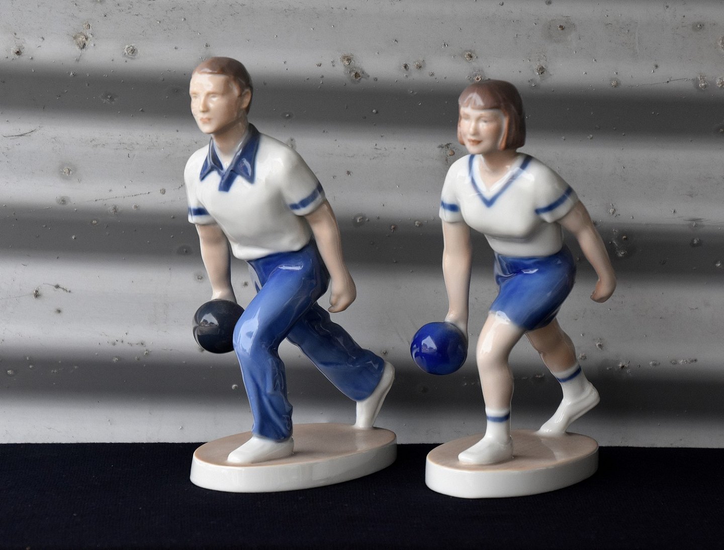 Figur i porcelæn med motiv af kvinde med bowlingkugle. Nr. 2487