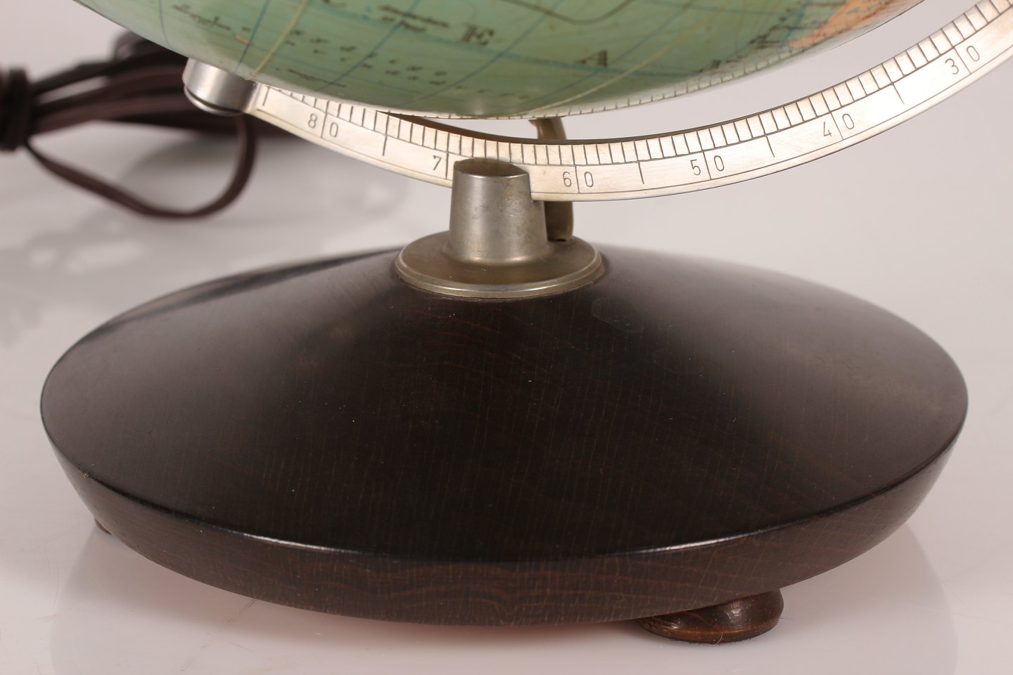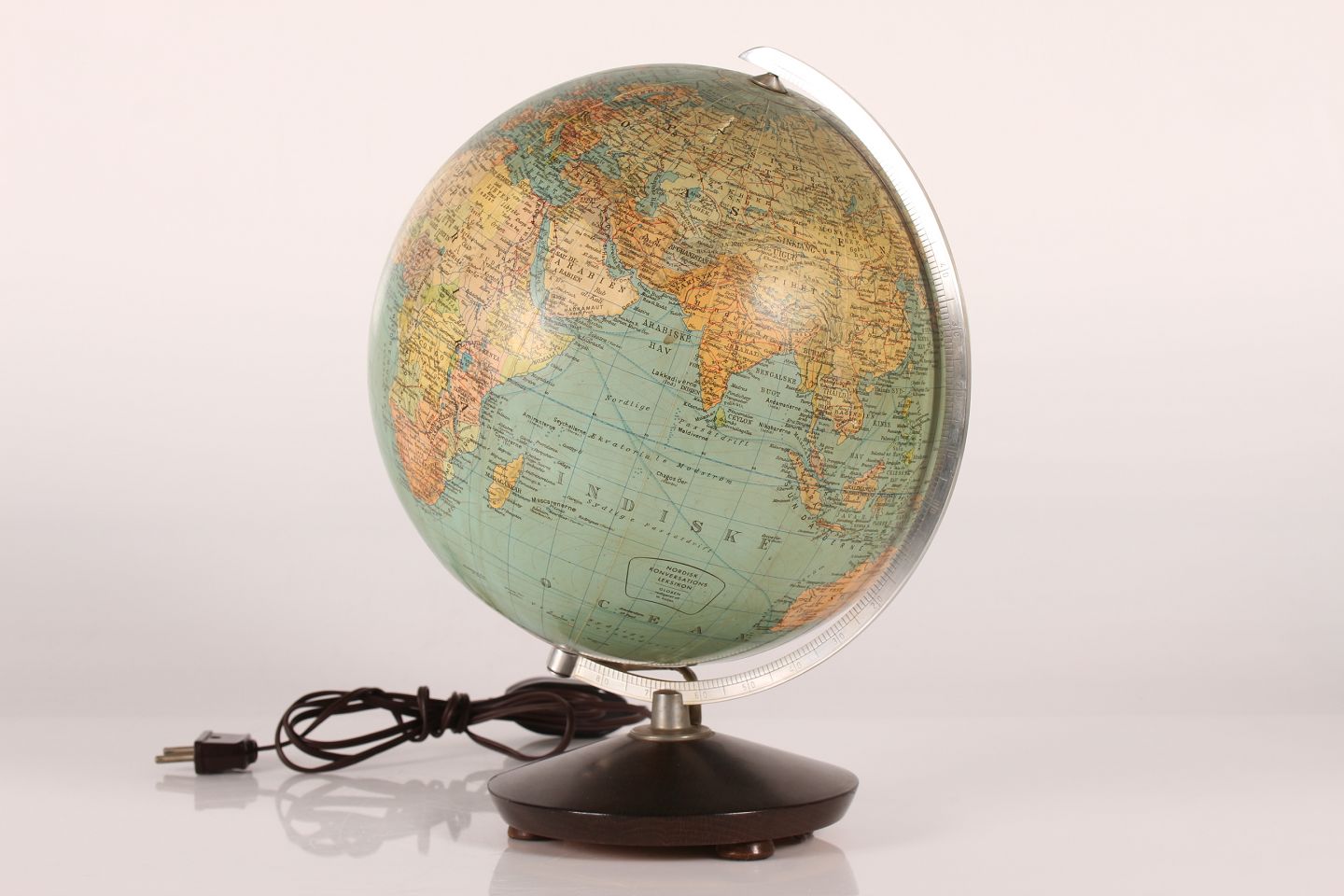 Gammel globus m/indlagt lys og stander af drejet massivt træ