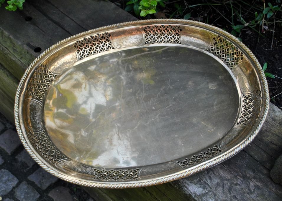 Oval kinesisk messing bakke, 19. årh. Med gennembrudt kant. Med dekorationer i form af blomster. 49 x 38 cm.