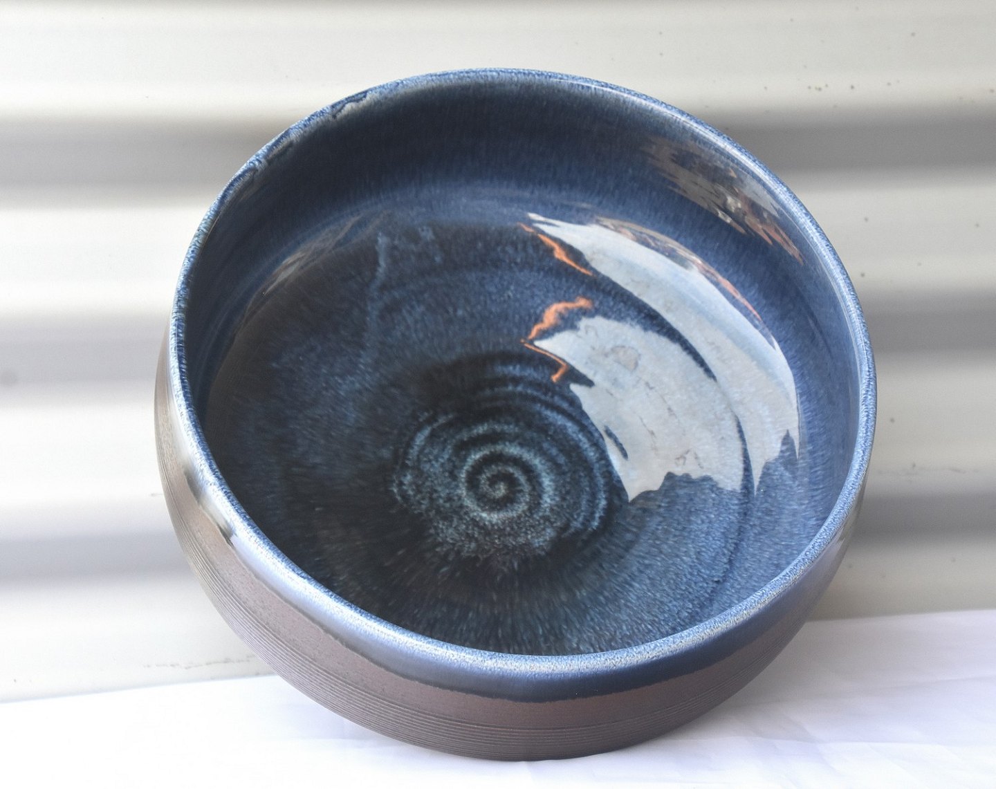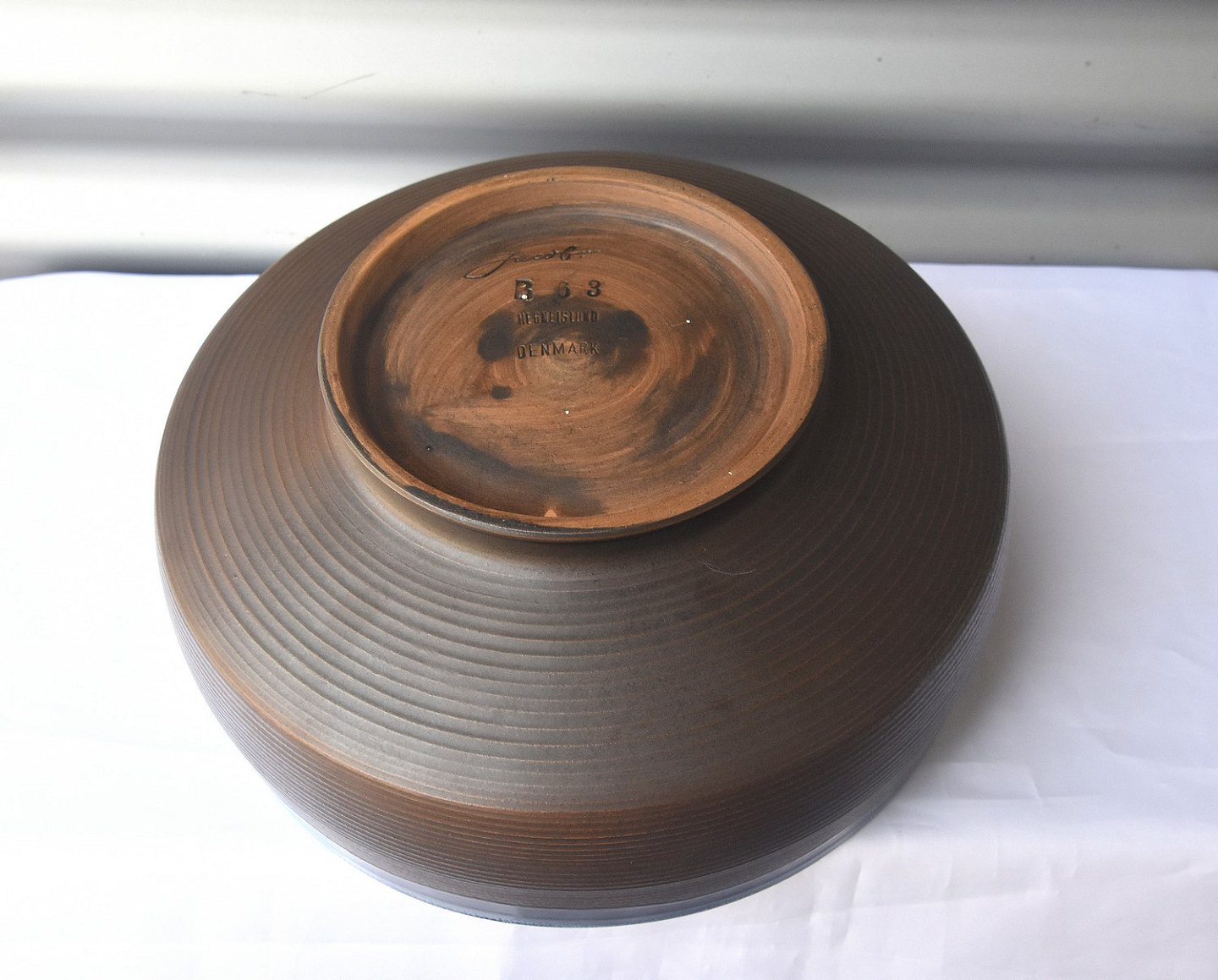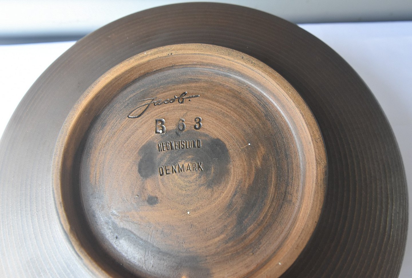 Skål med riflet glasur i blålige og brune farver. Stemplet Jacob B og Hegnetslund, Danmark