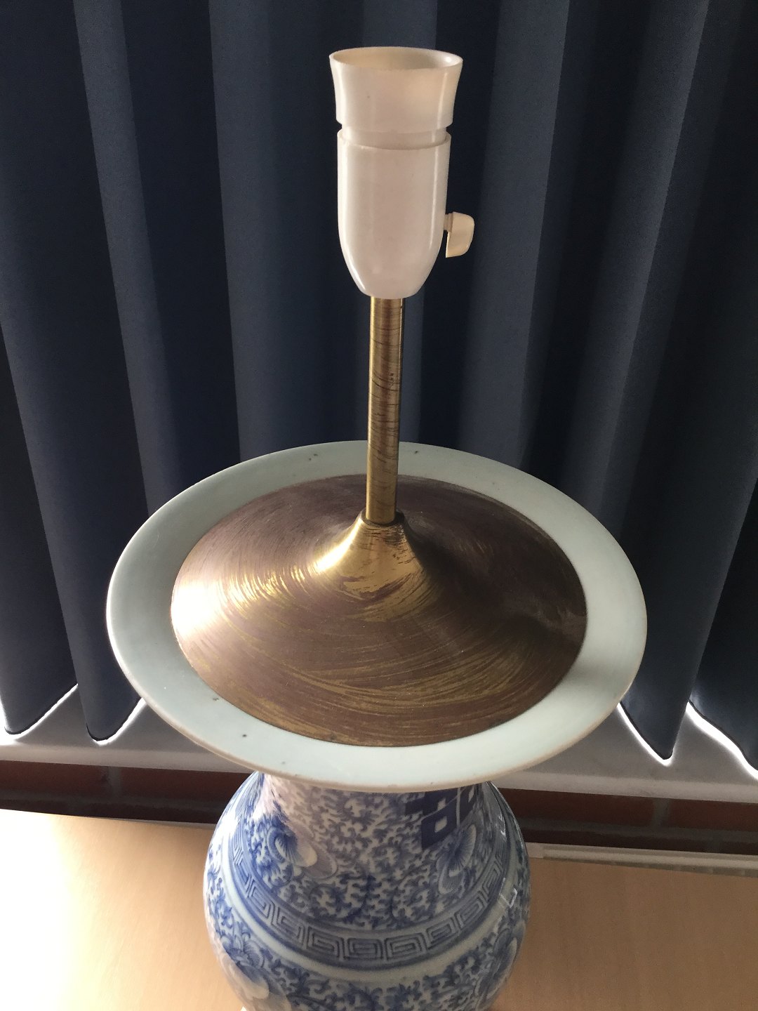 Vasen er monteret med træ stand og messingmontering i top. Den er gennemboret i bund for ledning.