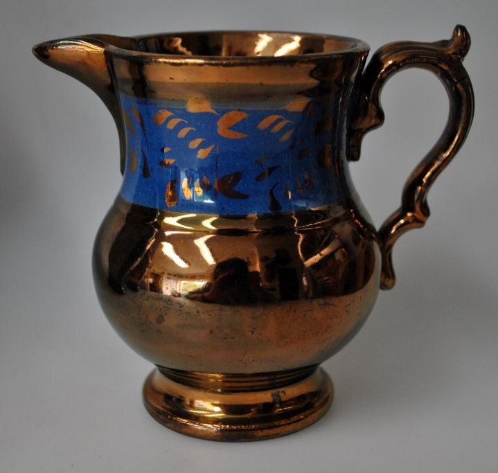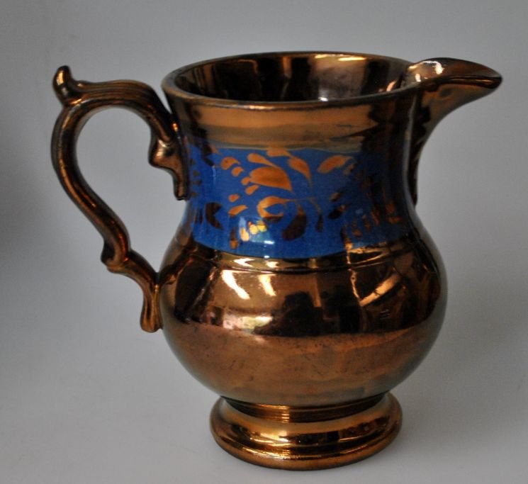 English luster jug, 19th century. With blue ribbon decoration and leaf patterns. H: 11 cm.