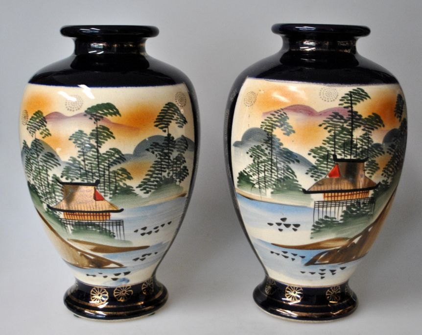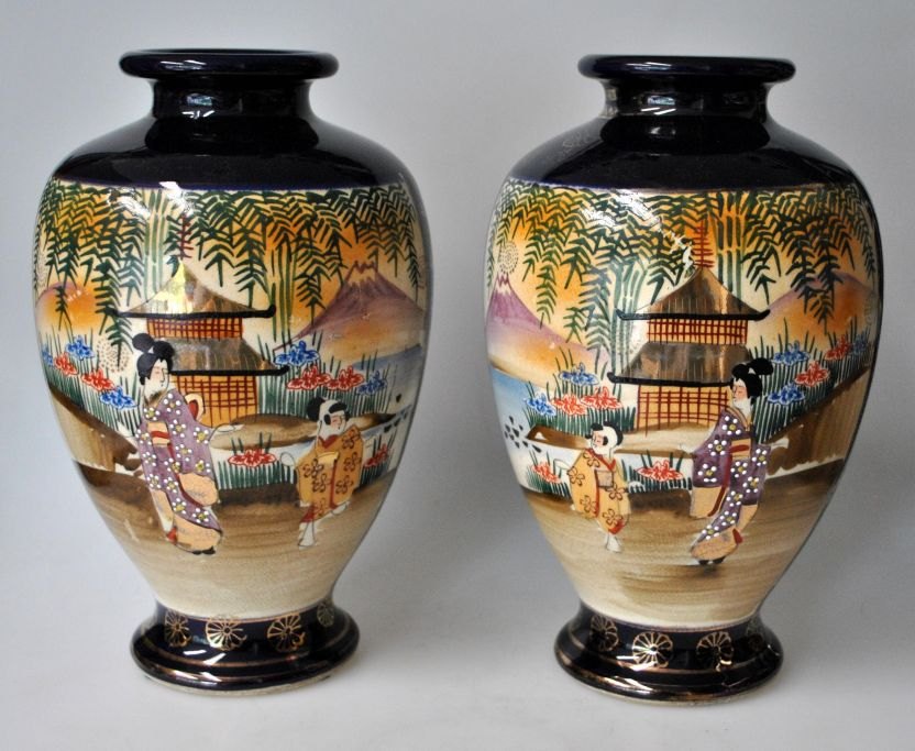 Par håndbemalede Satsuma vaser, 20. årh. Japan. Polykrom dekoration med kvinde foran hus og Fuji bjerget og et hus ved en bugt. Desuden blådekoreret og med forgyldning med bl.a. Lotus blomster. Signeret. H.: 23 cm.