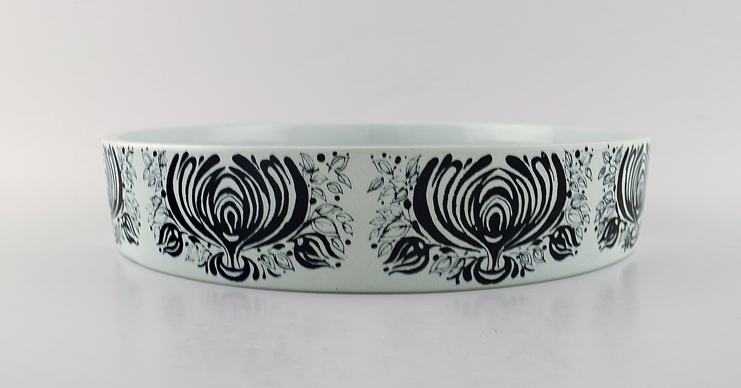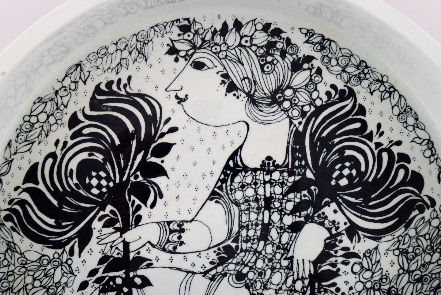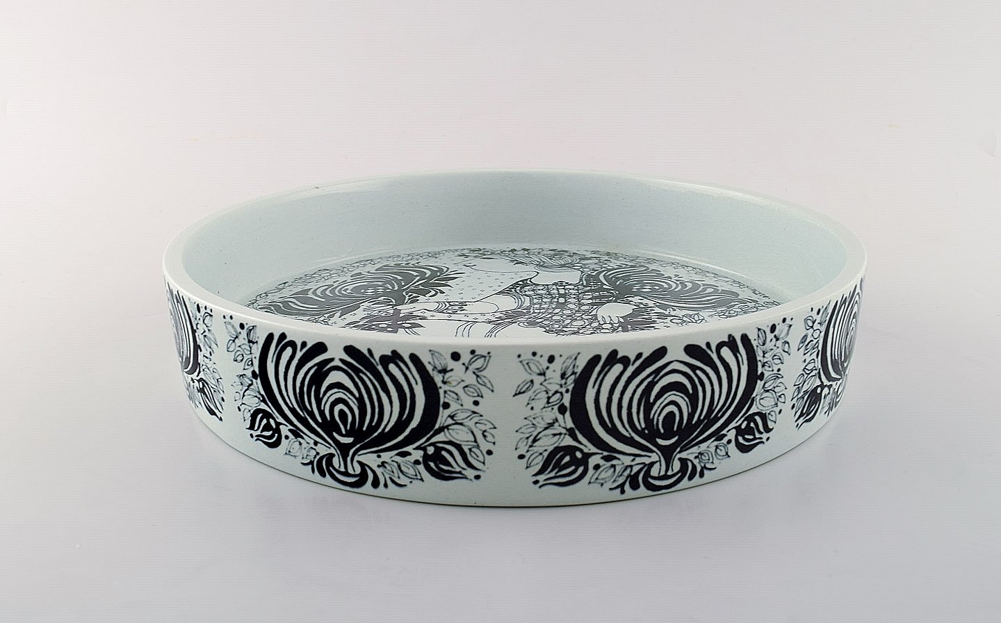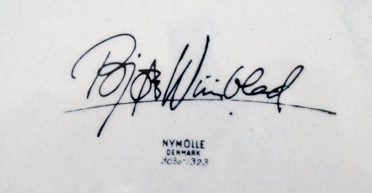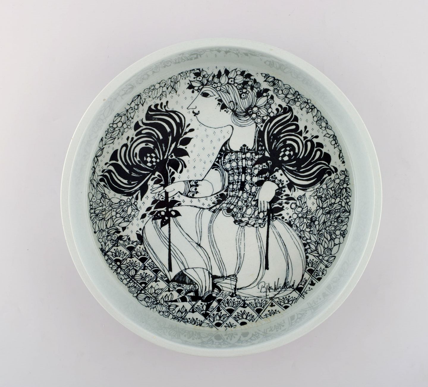 Bjørn Wiinblad for Nymølle. Stor skål i glaseret keramik med motiv af kvinde med fugle. 1970'erne.