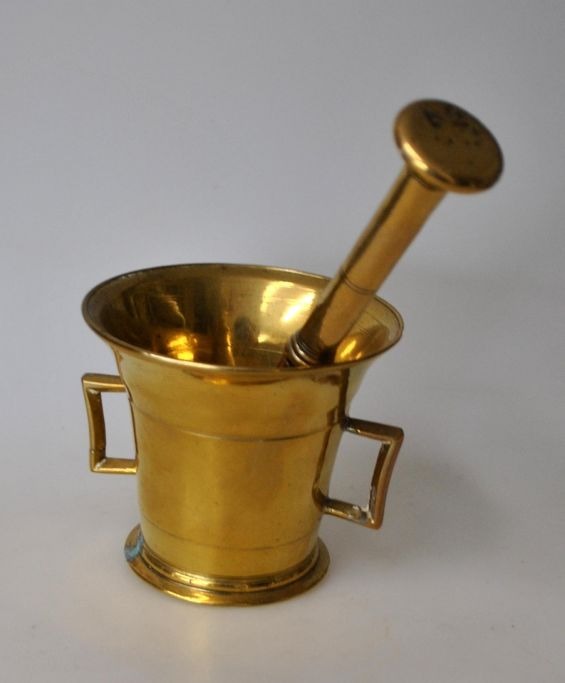 Brass mortar with pistil, 19th century Denmark. H: 9.5 cm. Length of pistil: 18.5 cm.