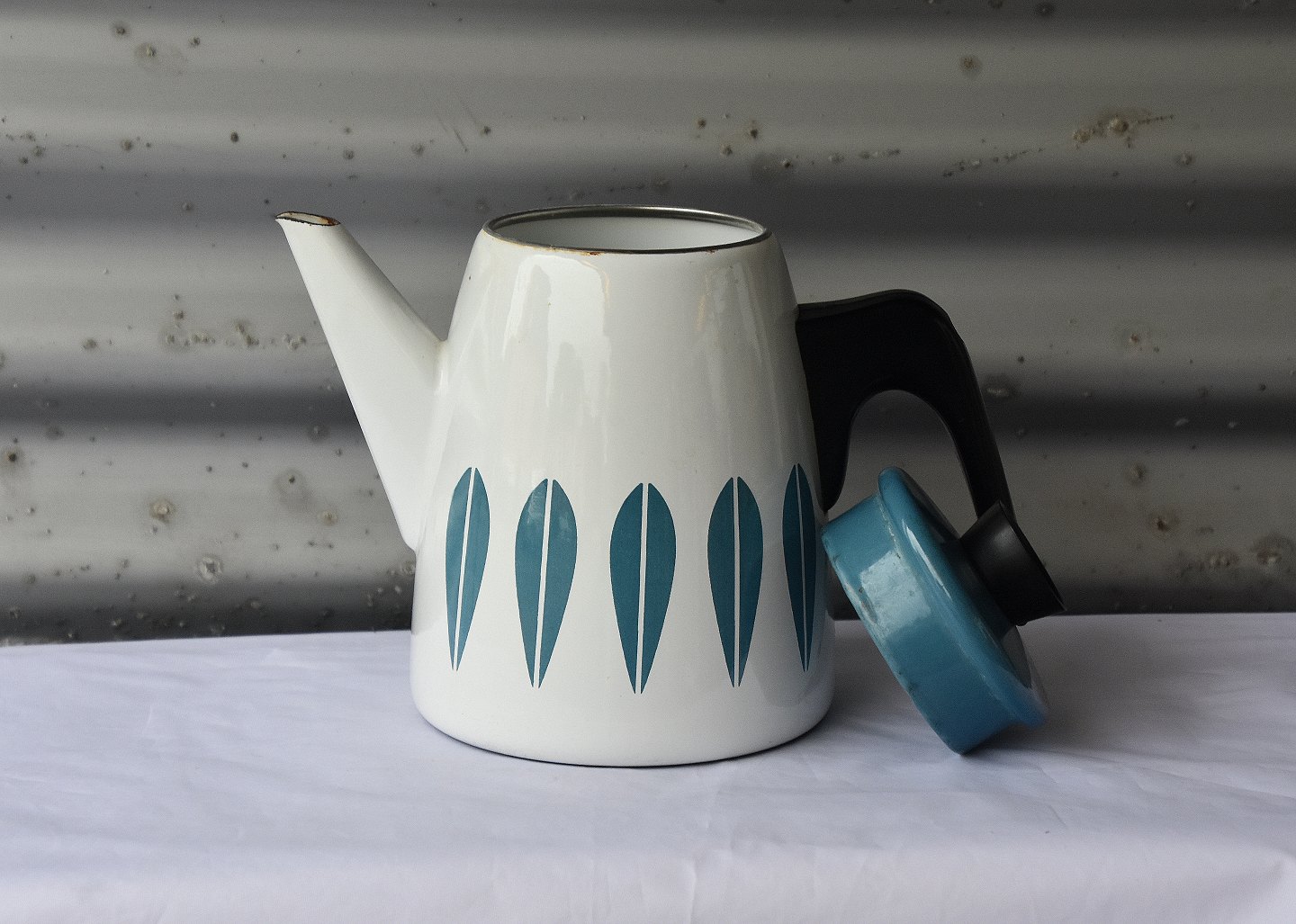 Lotus Kaffekande, hvid med blå blade og hvid baggrund, låget er også blåt. kaffekanden er emaljeret.