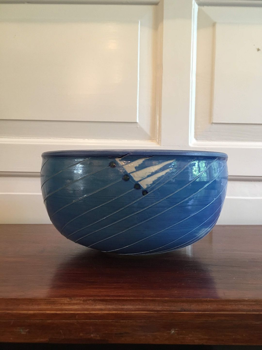Skål i blåglaseret stentøj med indridsninger i skærven,