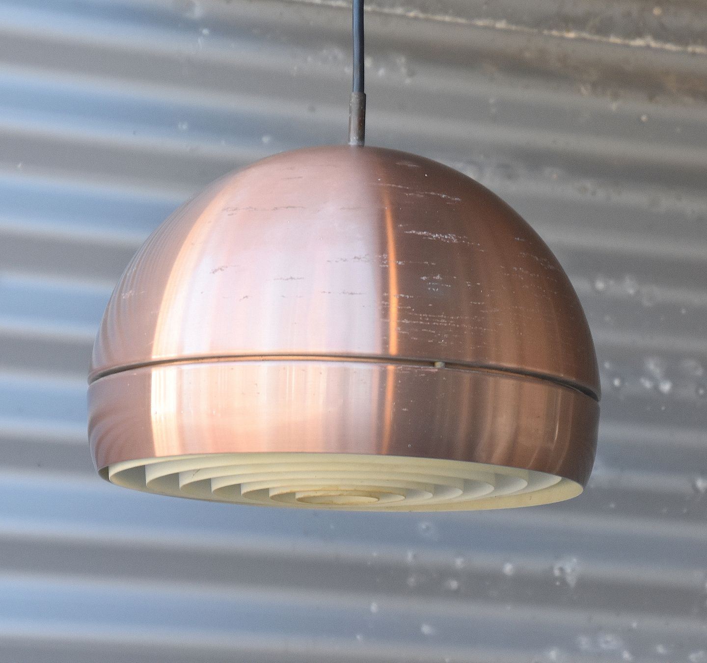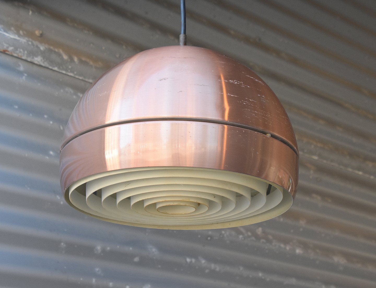 Kugleformet pendel kobber. Lampen er lakeret hvid indvendig