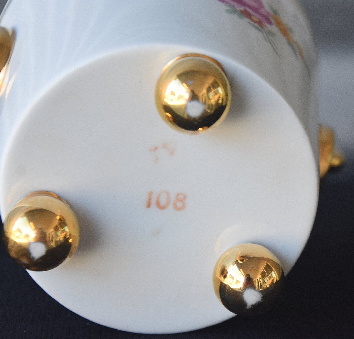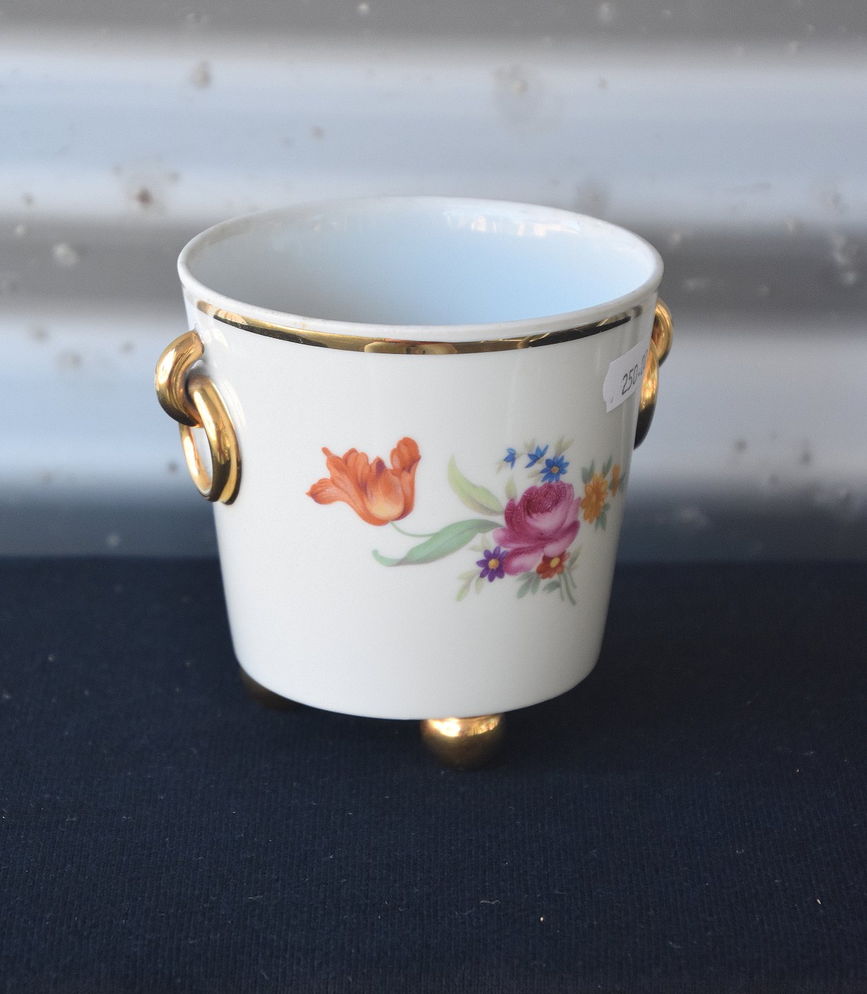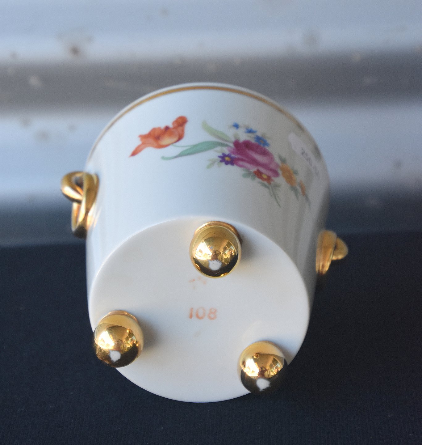 Text available in Danish: Tysk urtepotteskjuler på guld kuglefødder. Urtepotteskjuleren er dekoreret med blomstermotiv i overførselsteknik, der er forgyldninger på urtepotteskjuleren.