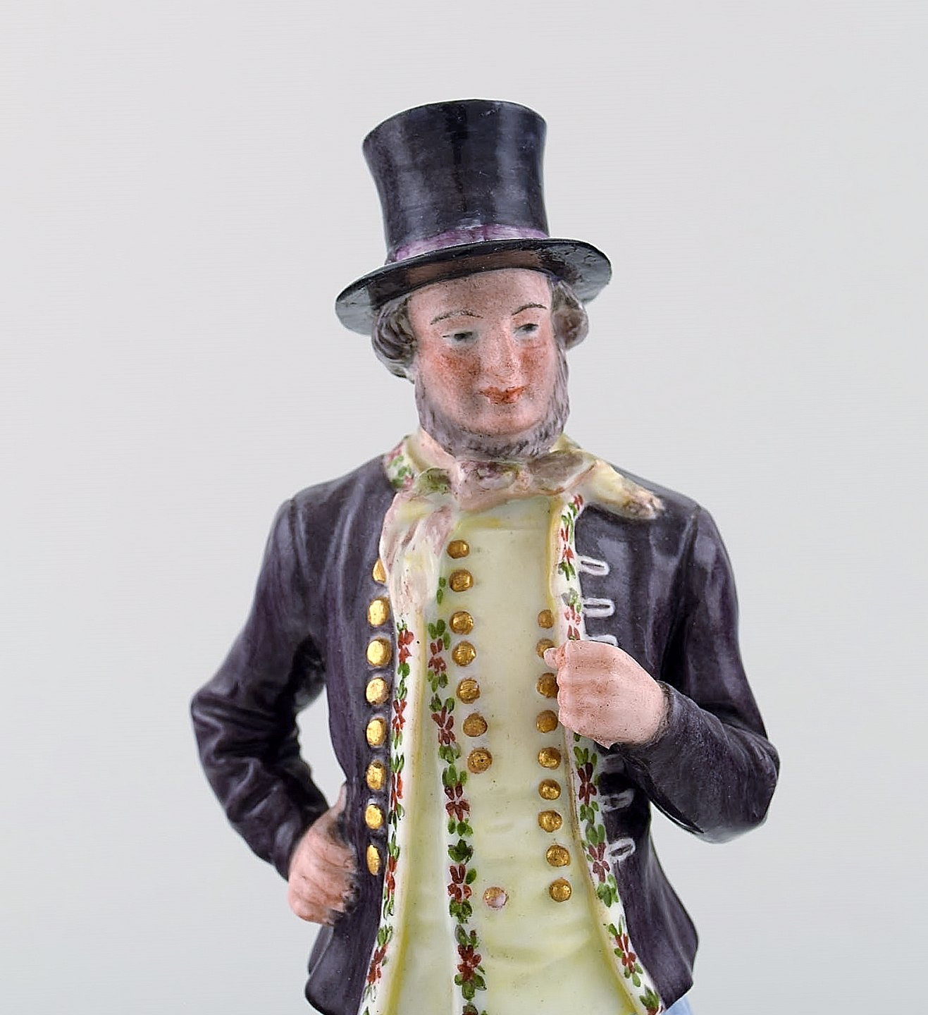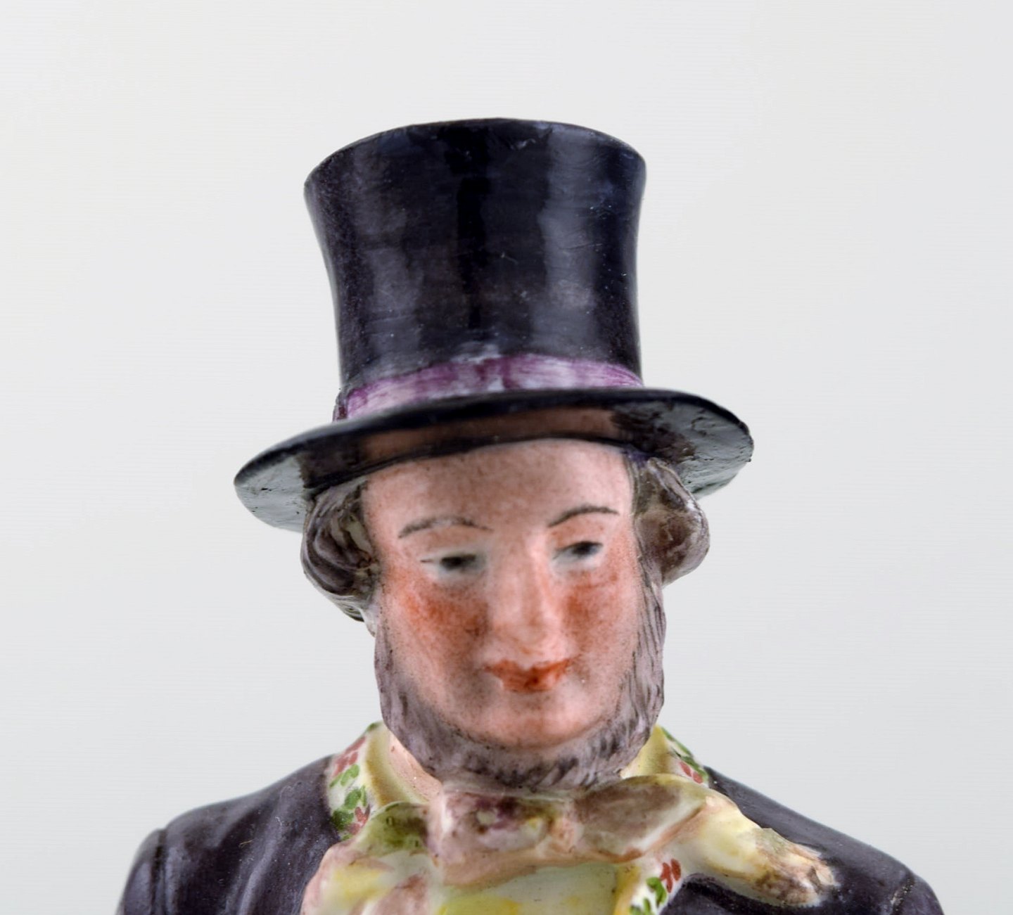 Antik og sjælden Bing & Grøndahl, B&G figur i nationaldragt. Overglasur i høj kvalitet. 1870'erne. Velklædt herre med høj hat.