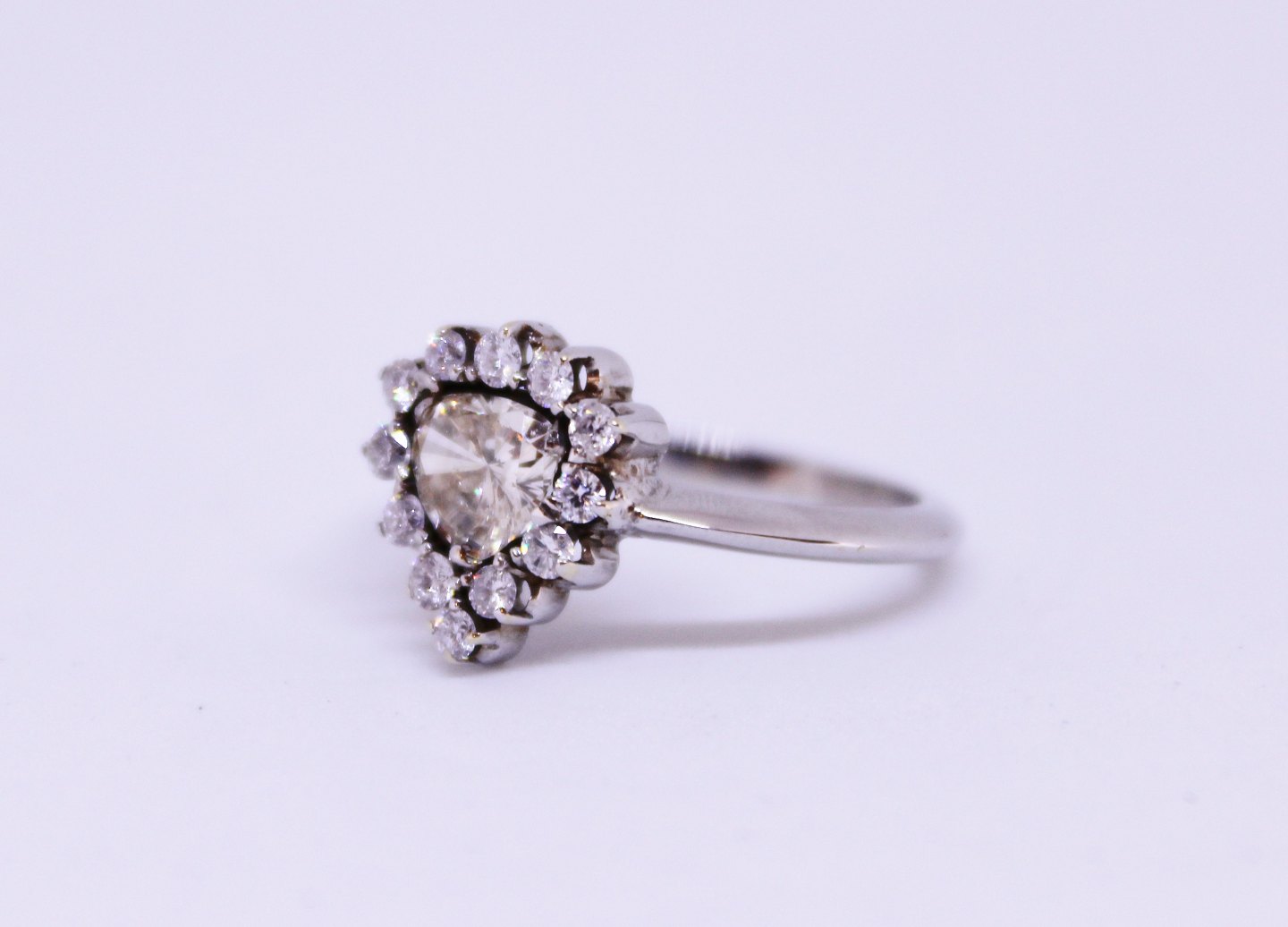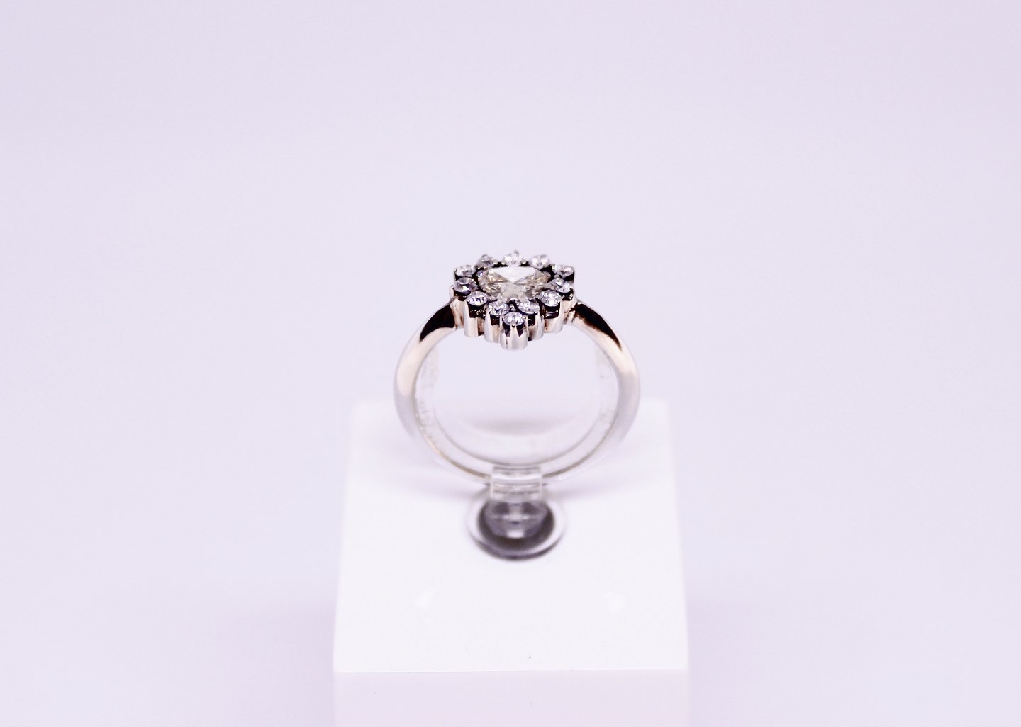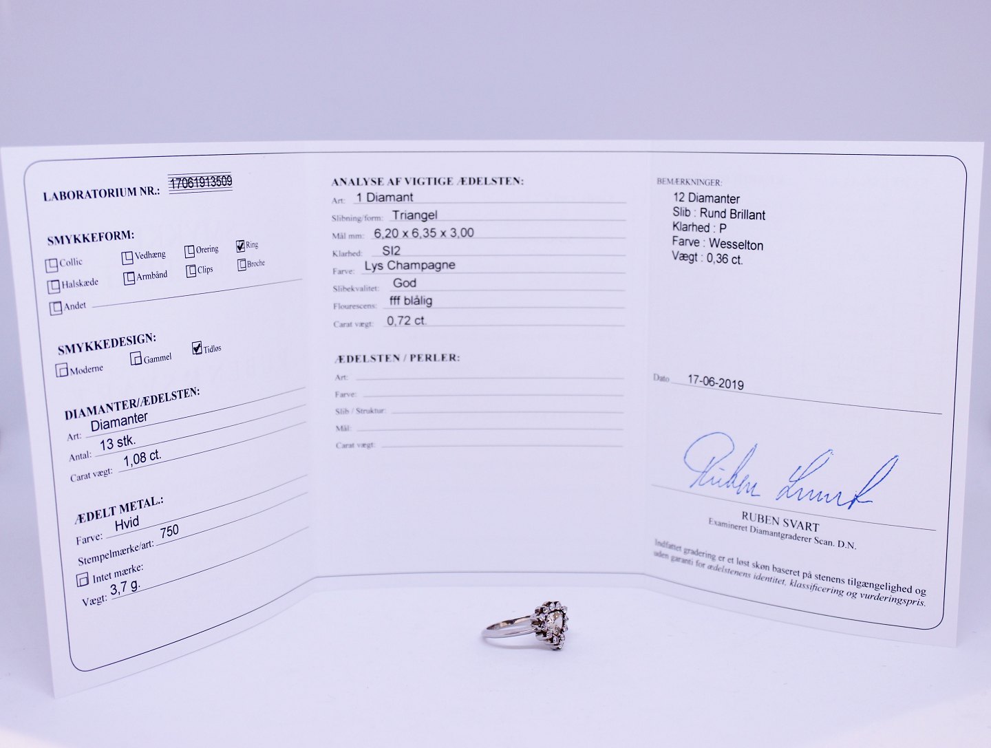Ring af 14 kt. hvidguld dekoreret med 13 diamanter. En triangel formet diamant af 0,72 kt. i farven lys champagne og klarhed S12. Samt 12 mindre diamanter af 0,36 kt. og i farven Wesselton.