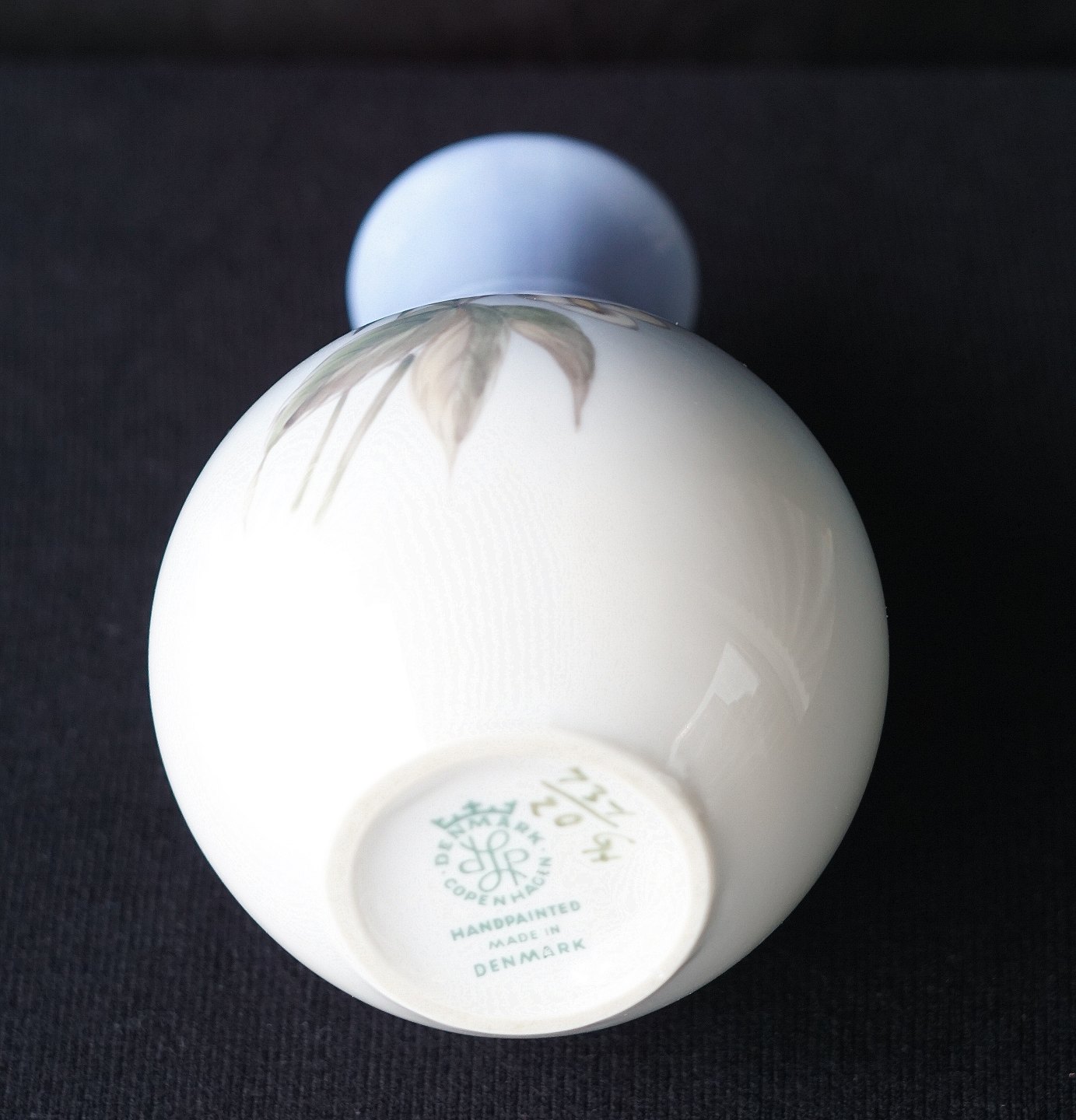 Lyngby Porcelæn, vase 73-1/20, 1. sortering. Dekoration er 2 udsprungne hvide blomster, vasen er håndmalet