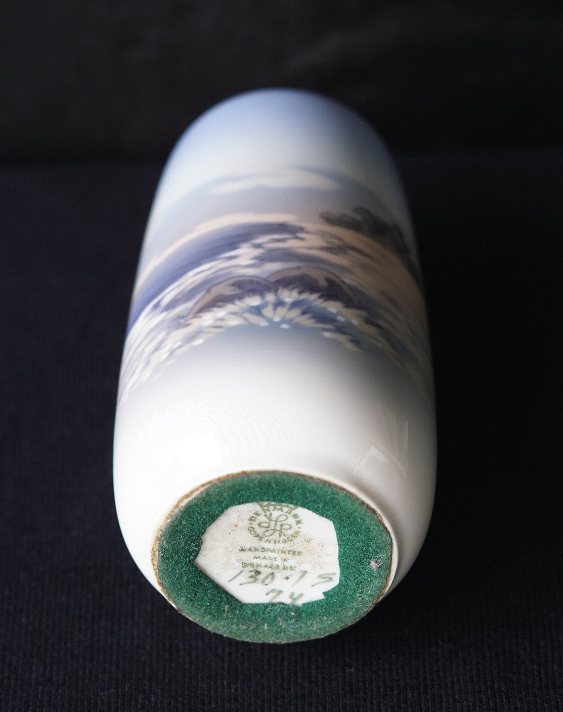 Lyngby Porcelæn, vase 130-1/75, 1. sortering. Vasen er håndmalet, dekorationen forestiller en vandkant, med 2 sten og bølger