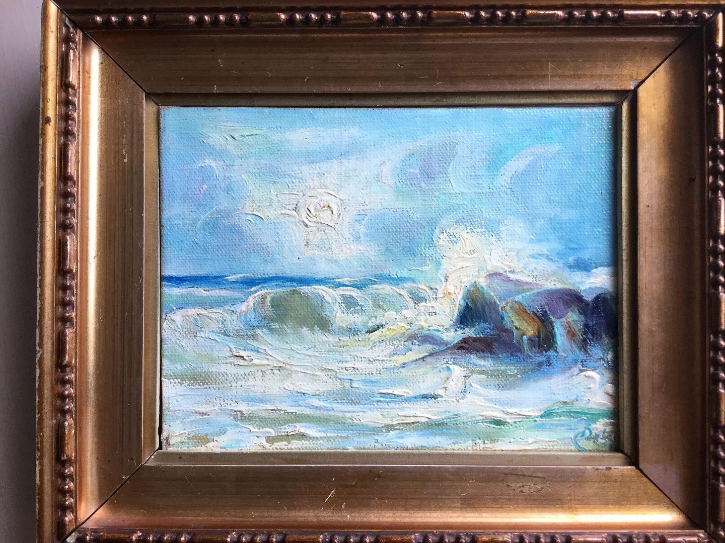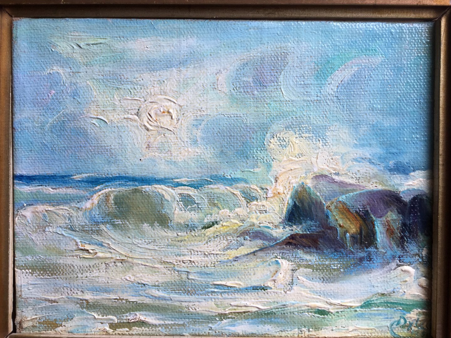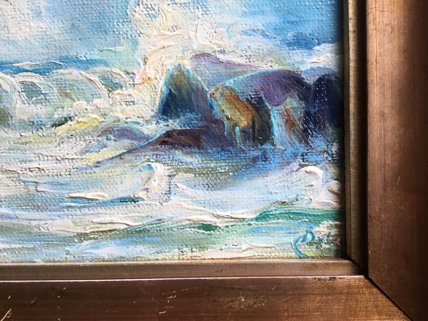 Maleri af Chr. Dybdal - Kystparti med skumsprøjt og klipper.