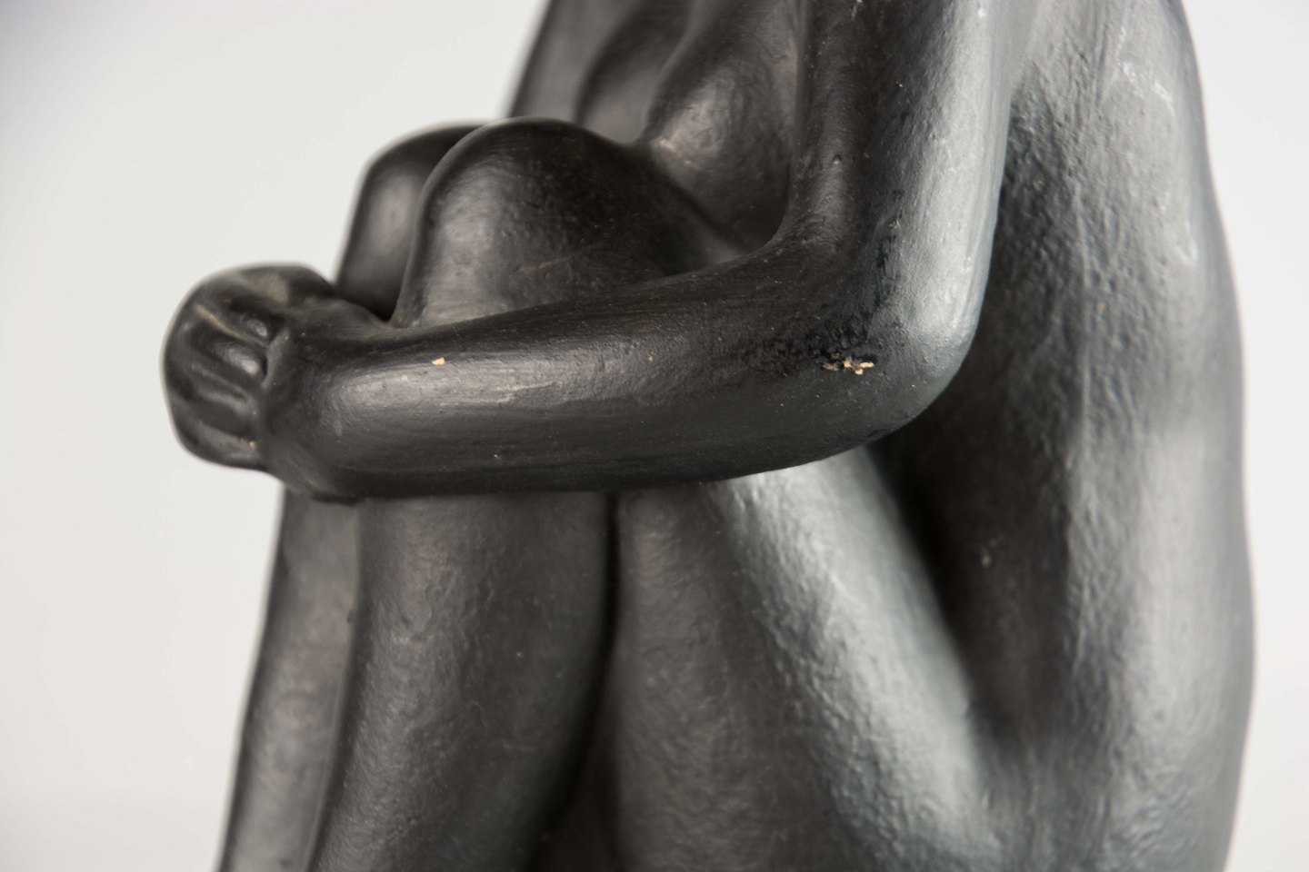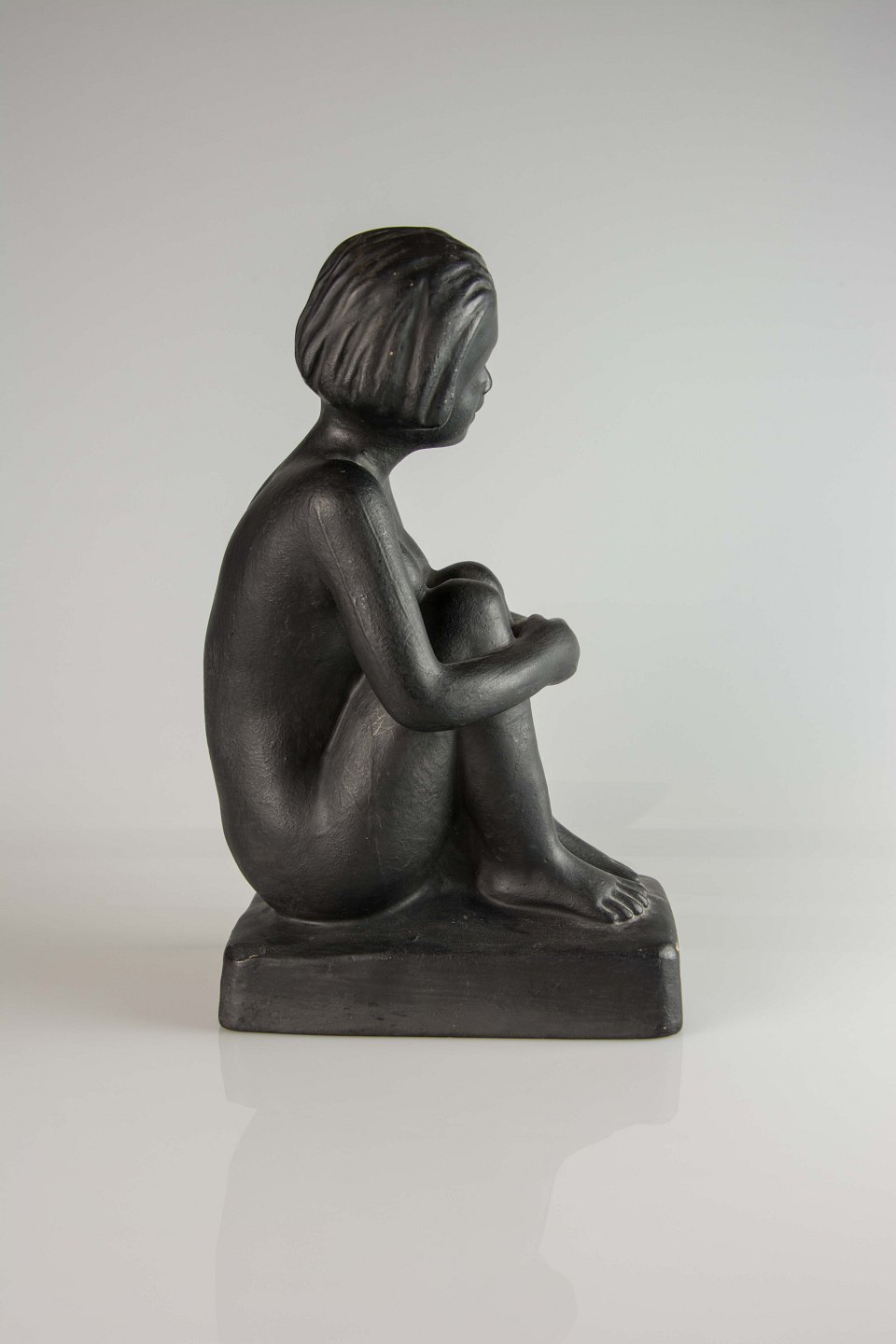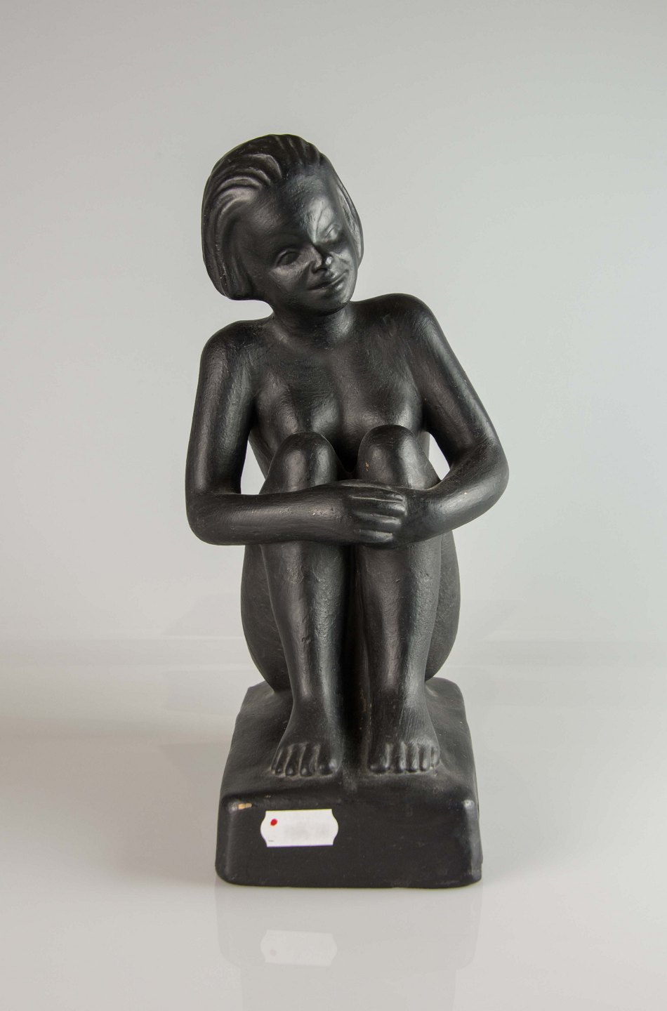 Figur i sort malet keramik med motiv af siddende nøgen kvinde