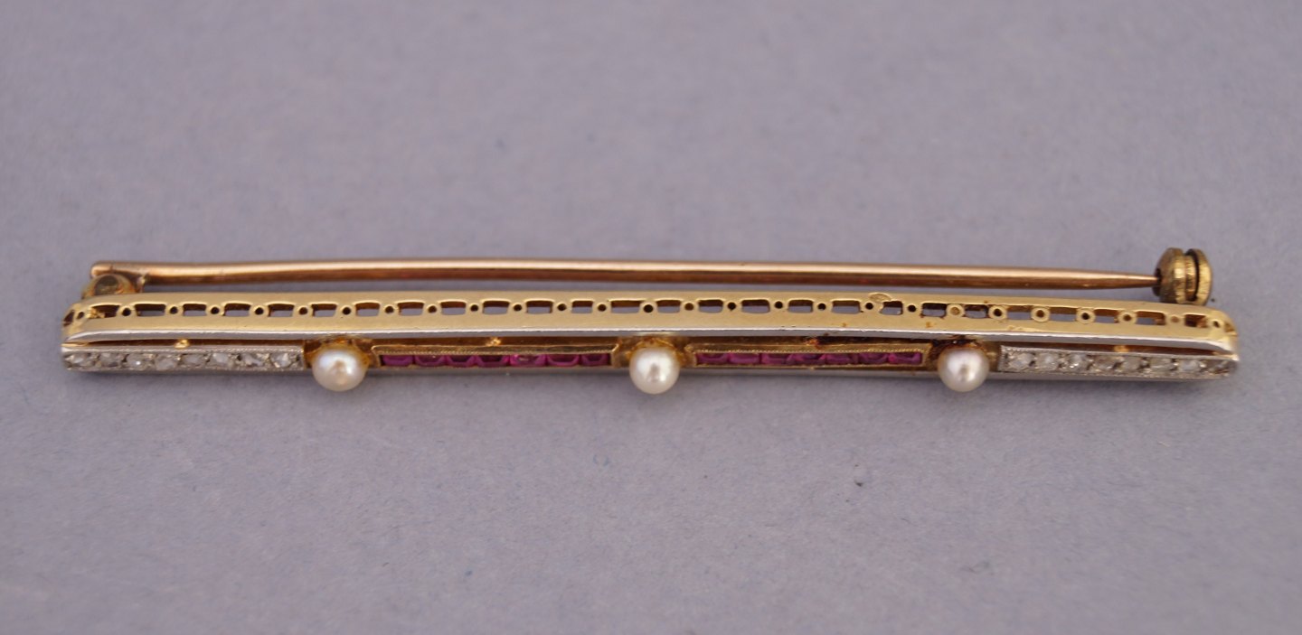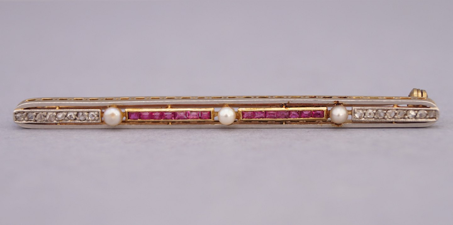 Broche af 14 kt. guld prydet med rubiner, diamanter og perler fattet i hvidguld. Broche omkring år 1910.