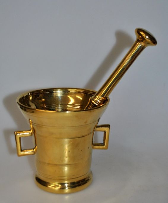 Danish brass mortar with associated pistil, 19th century. Stamped: ST. Height 11 cm. Diameter: 11.2 cm. Pistil length: 21 cm.