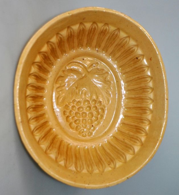 Bornholmsk buddinge form, 19. årh. Danmark. Gul glaseret. Oval. Indvendig med vin klase. L.: 26,5 cm. B.: 23 cm. H.: 12 cm.