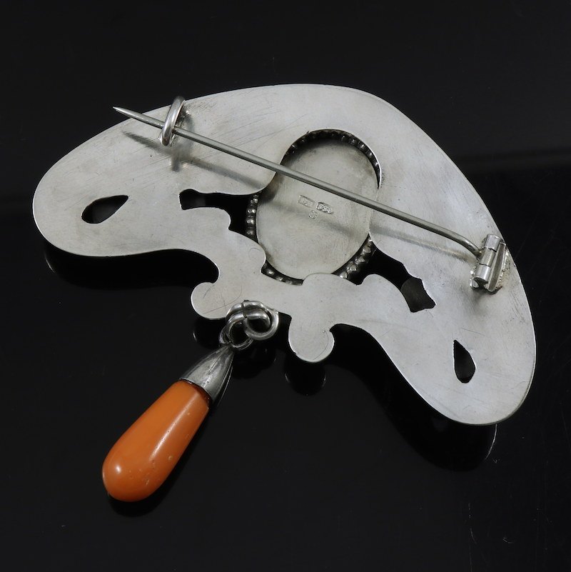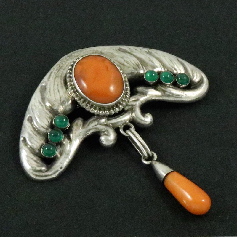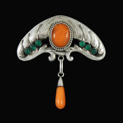 Bernhard Hertz. Art Nouveau Silver Brooch with Amber and Green Agate.