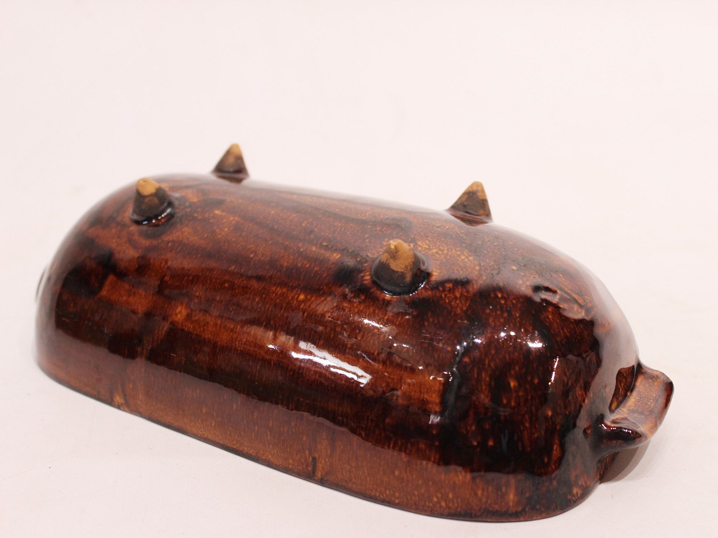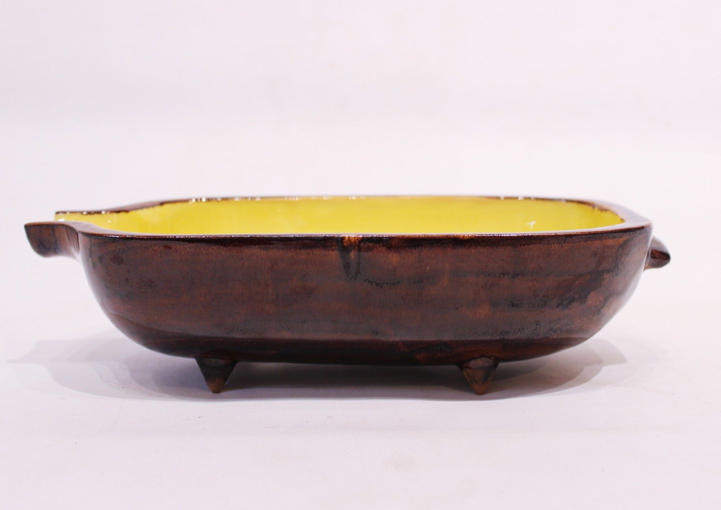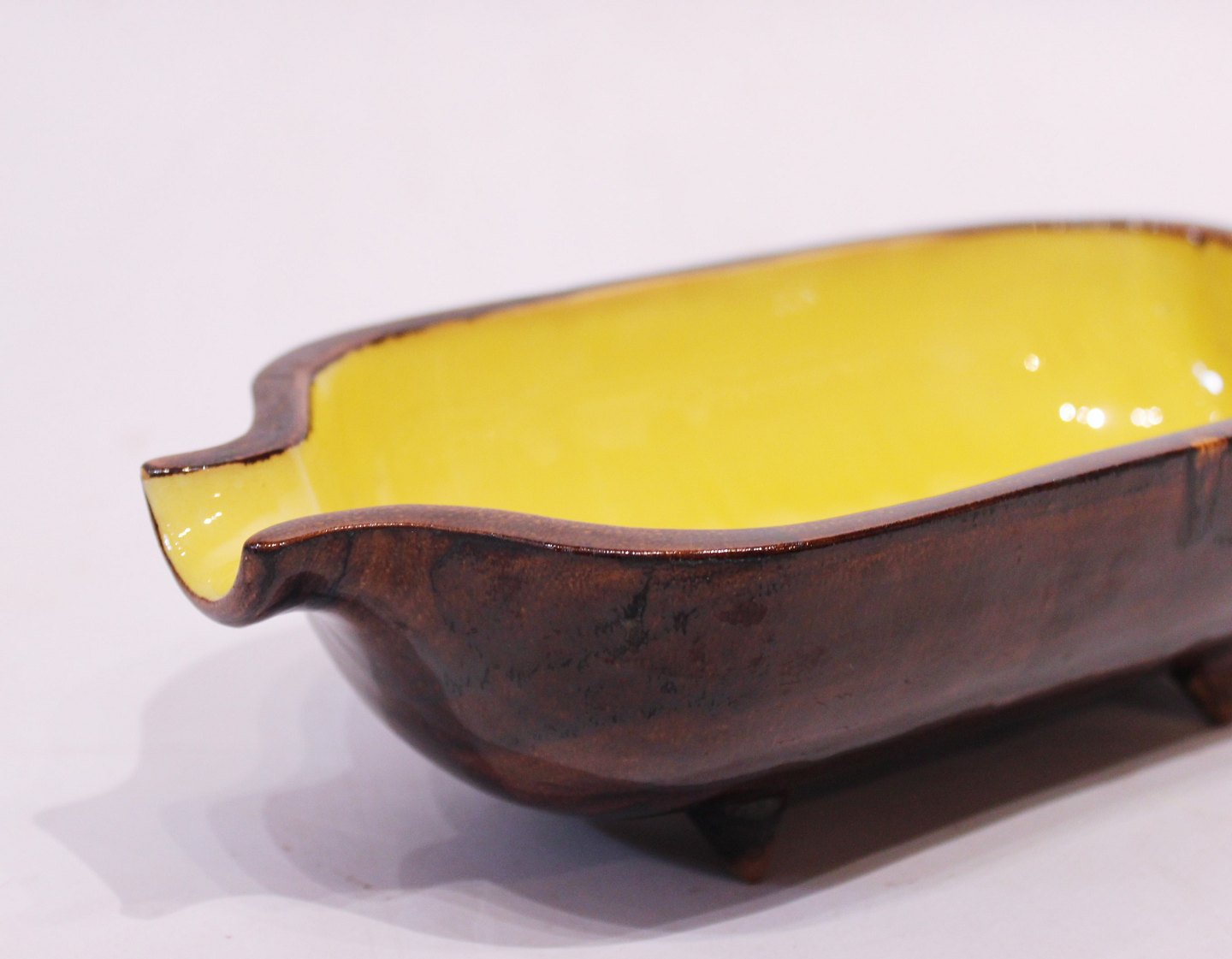 Keramik skål på fødder med brun glasur udvendig og gul indvendig, dansk design, 1960erne.