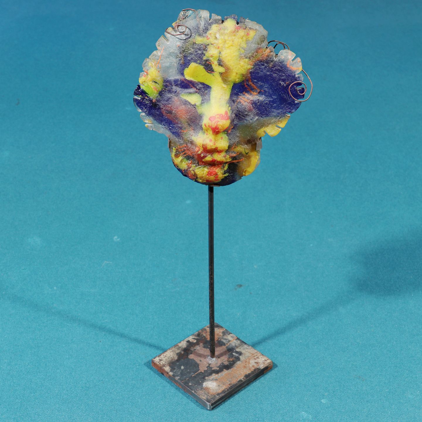 Maske i farvet glas og jern af Sven Holst Pedersen, 42 cm høj