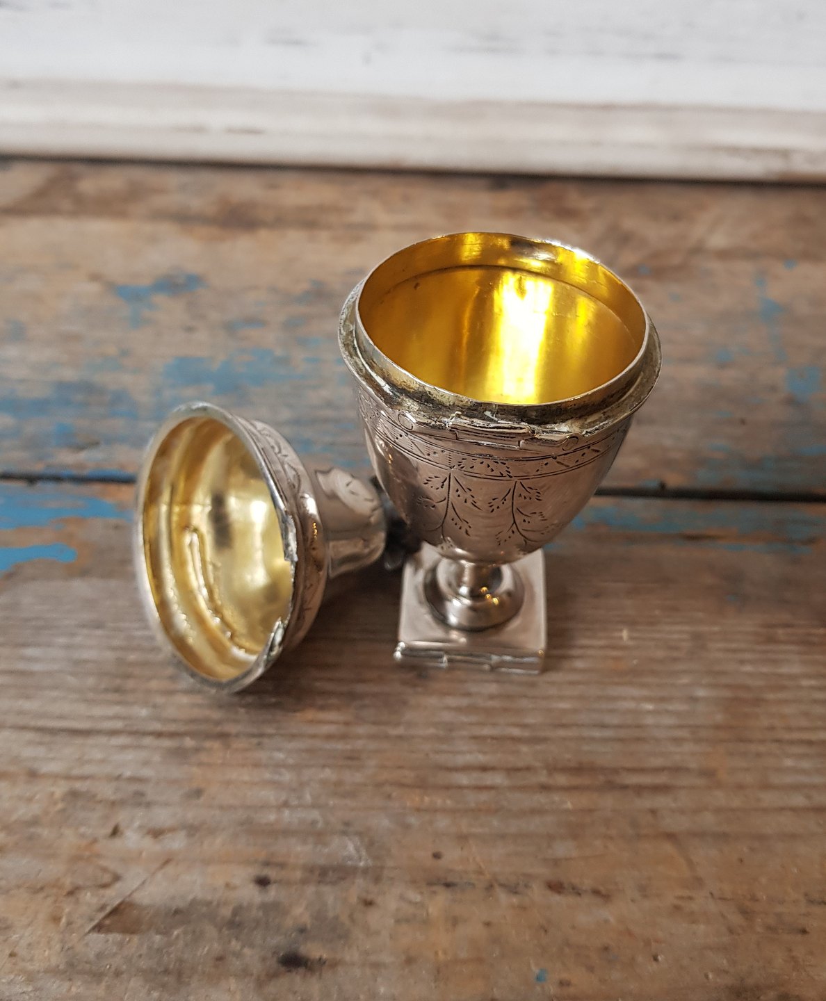 Hovedvandsæg i sølv indvendigt forgyldt, firkantet fod med gemme.