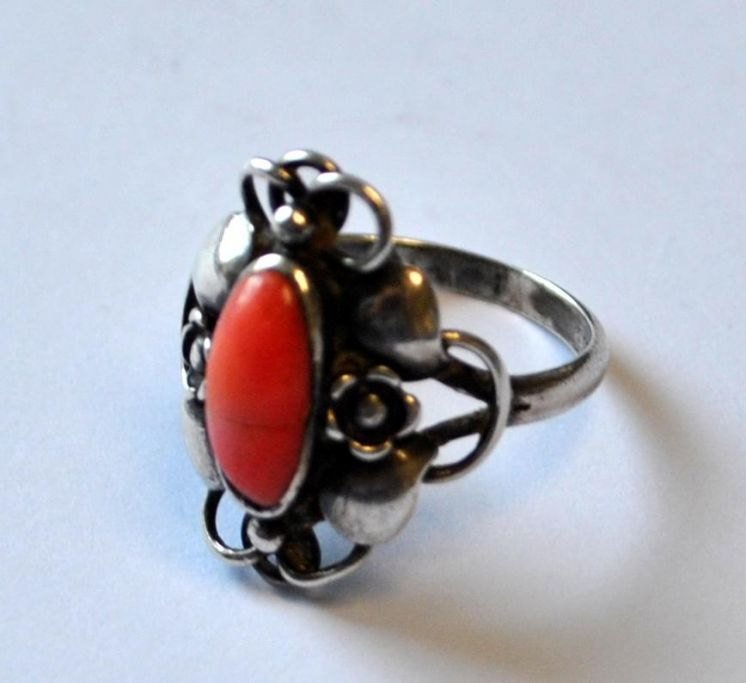 Sølvring med rød koral, Hans Jensen & Co, København (1899 - 1937). Stemplet. Størrelse: 56. Derydes ingen rabat på dette lot!