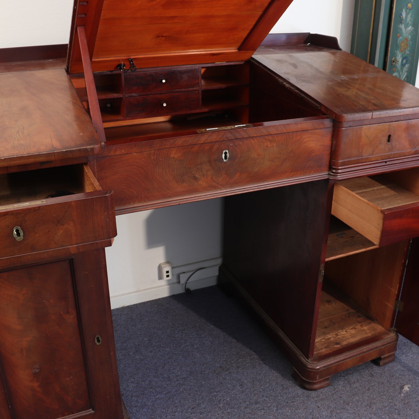 Skrivepult i mahogni med klap, skabe og skuffer,