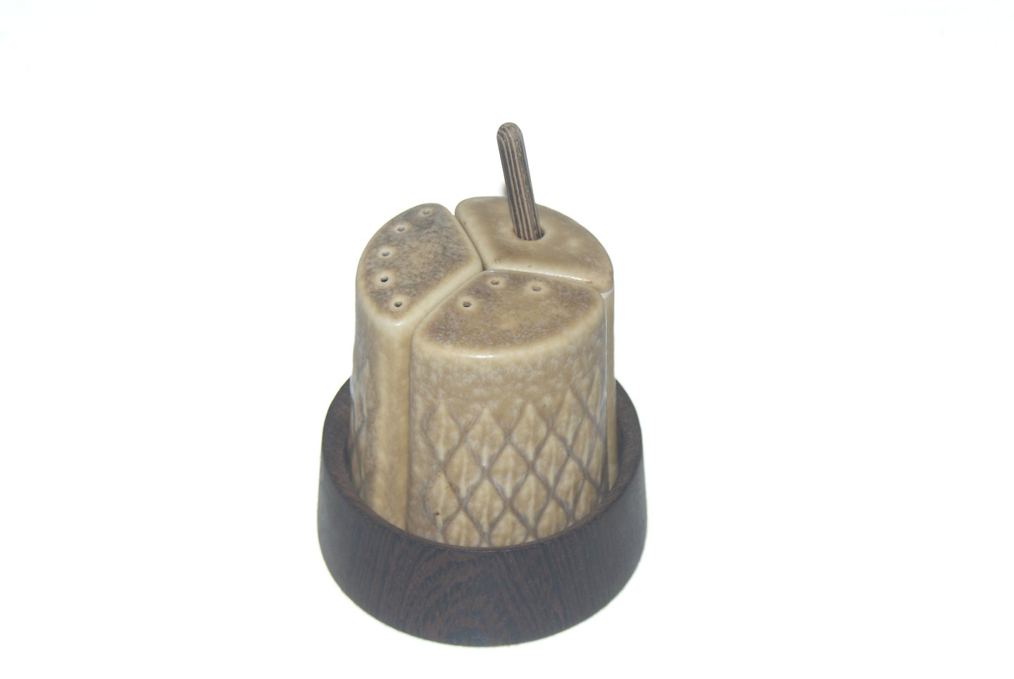 Bing & Grøndahl/Nissen/Kronjyden, Relief stentøj, saltbøsse, peberbøsse og sennepskrukke i træskål