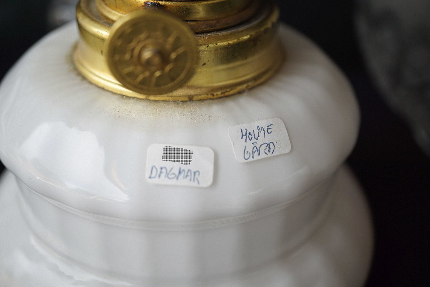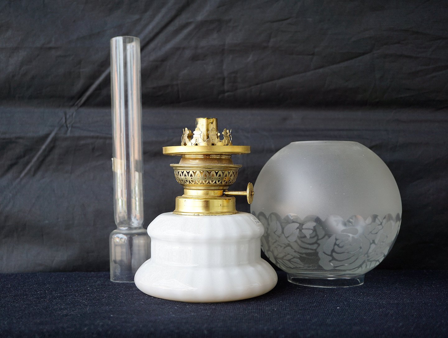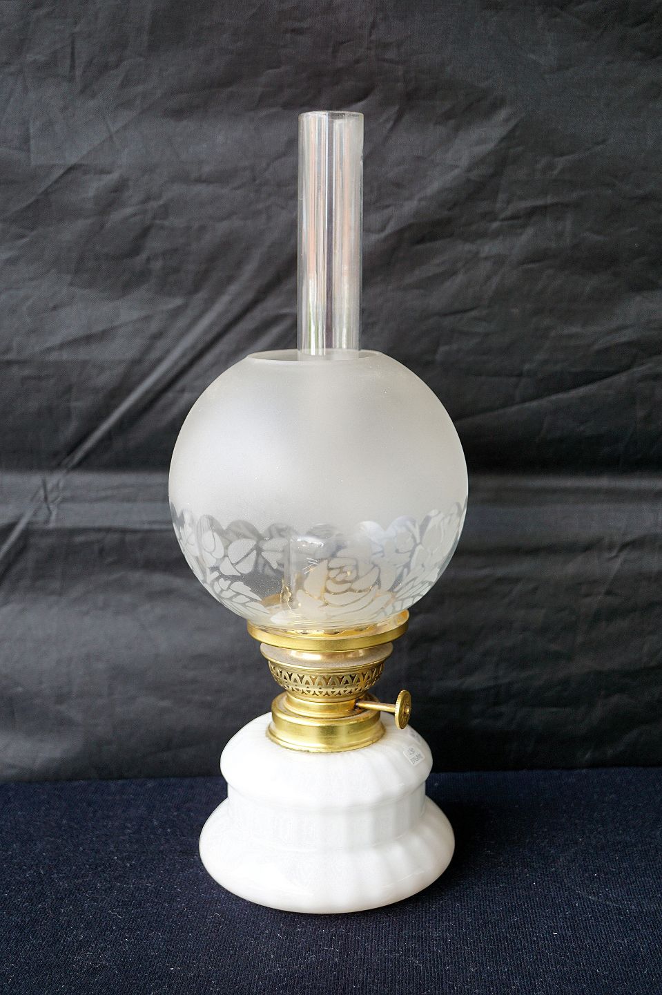Dagmar olielampe, foden er af hvidt opalglas. Produceret både som olielampe og som el lampe. Inderste glasrør kan variere i højde.