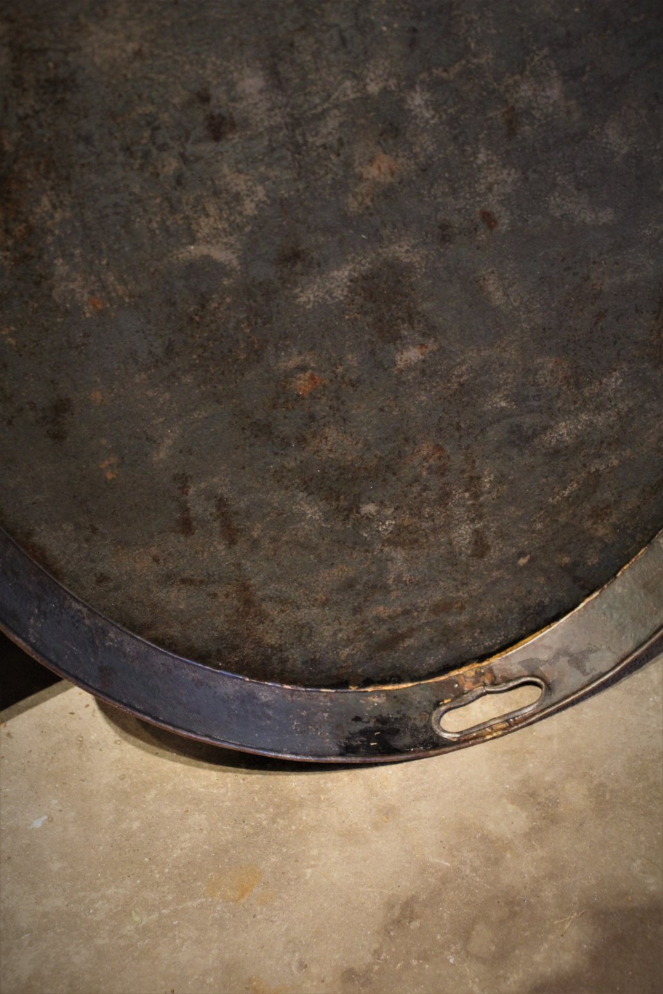 Old raw French oval tray in trimmed iron and with a super nice patina. Measures: 67x48.5cm. H: 5cm.