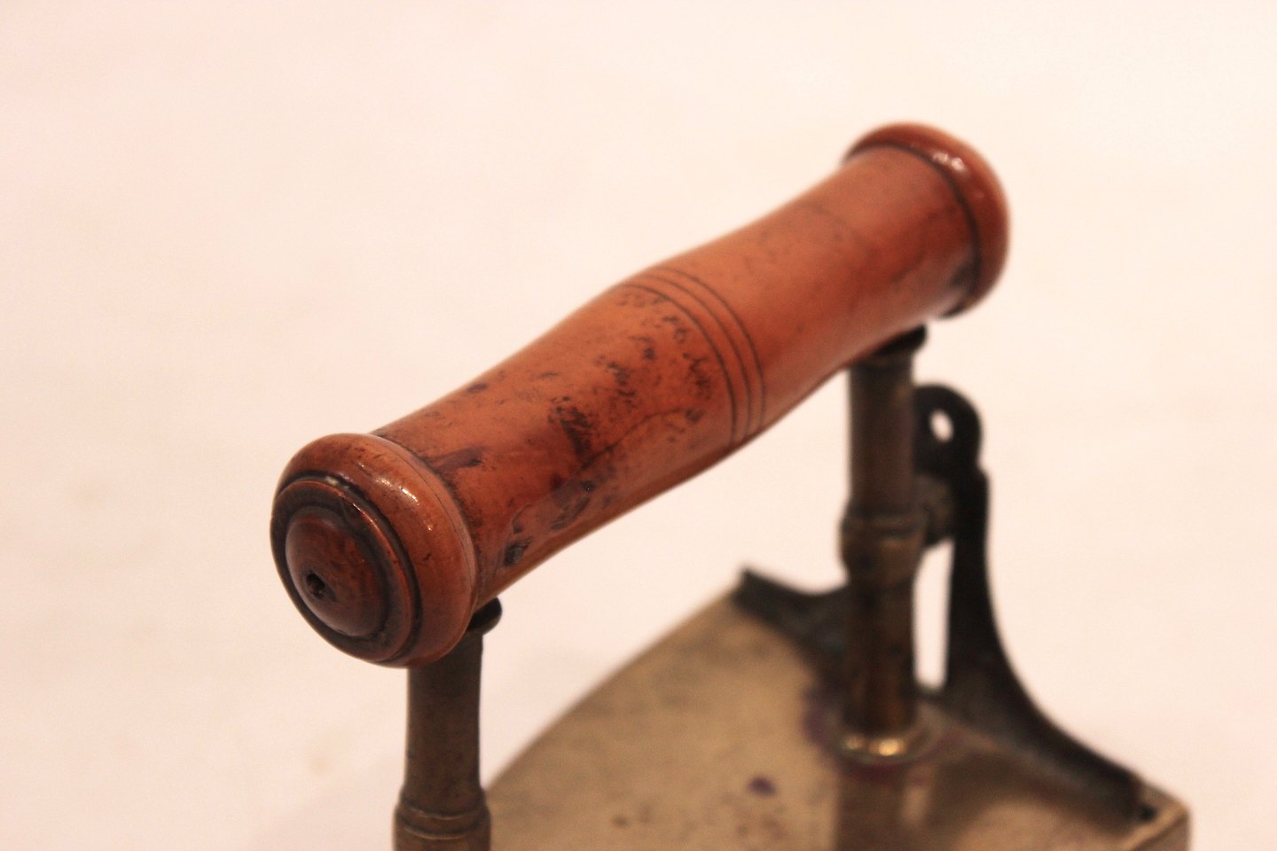 A pair of antique irons, both with wooden handles and of respectively iron and brass.