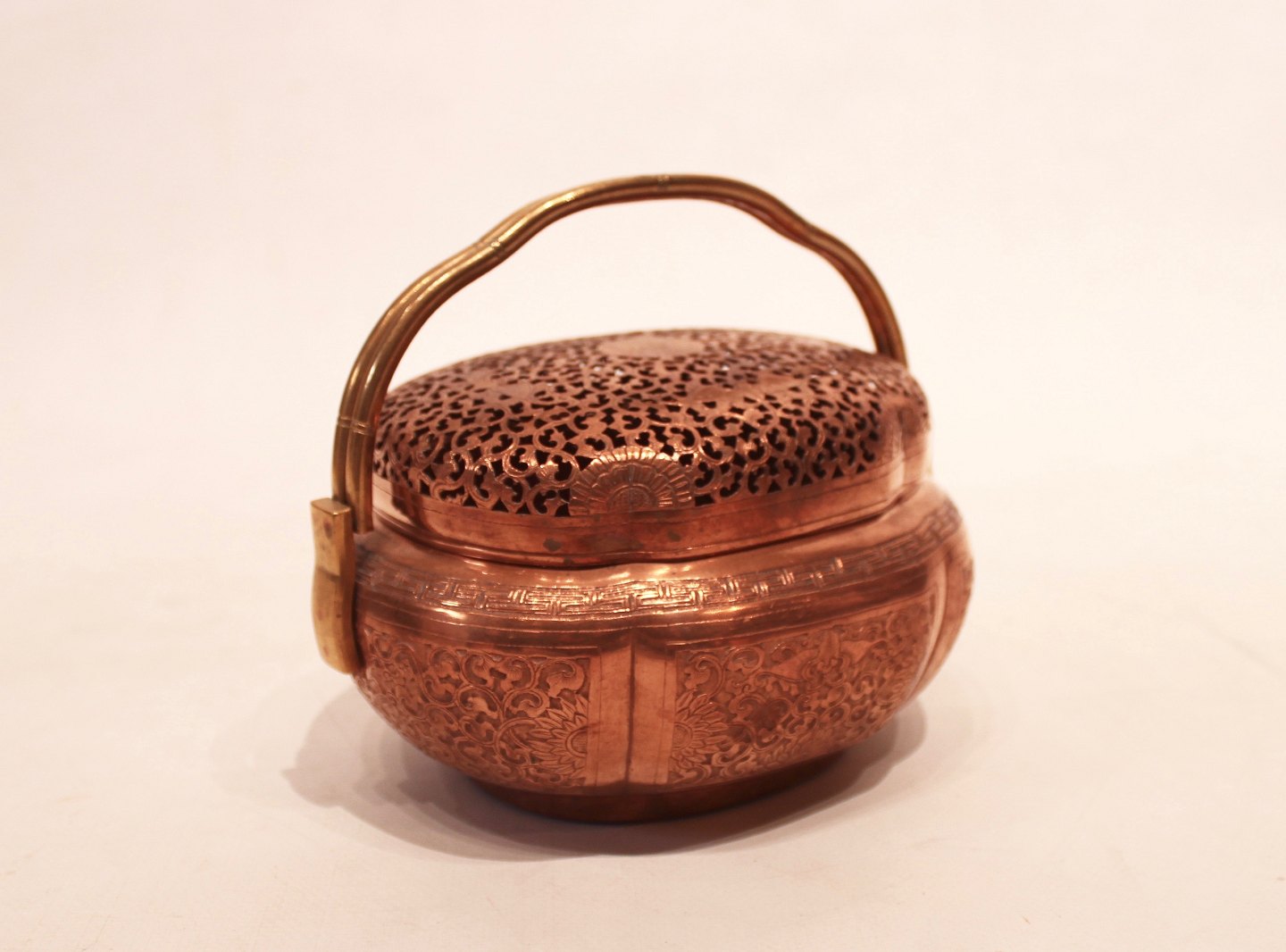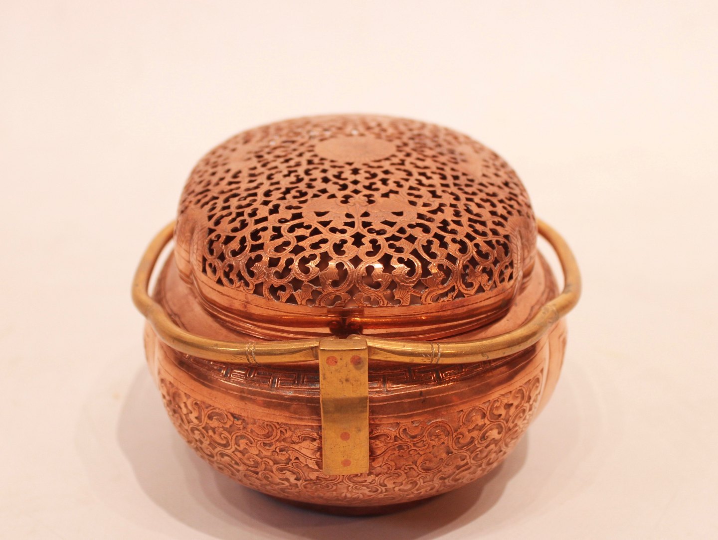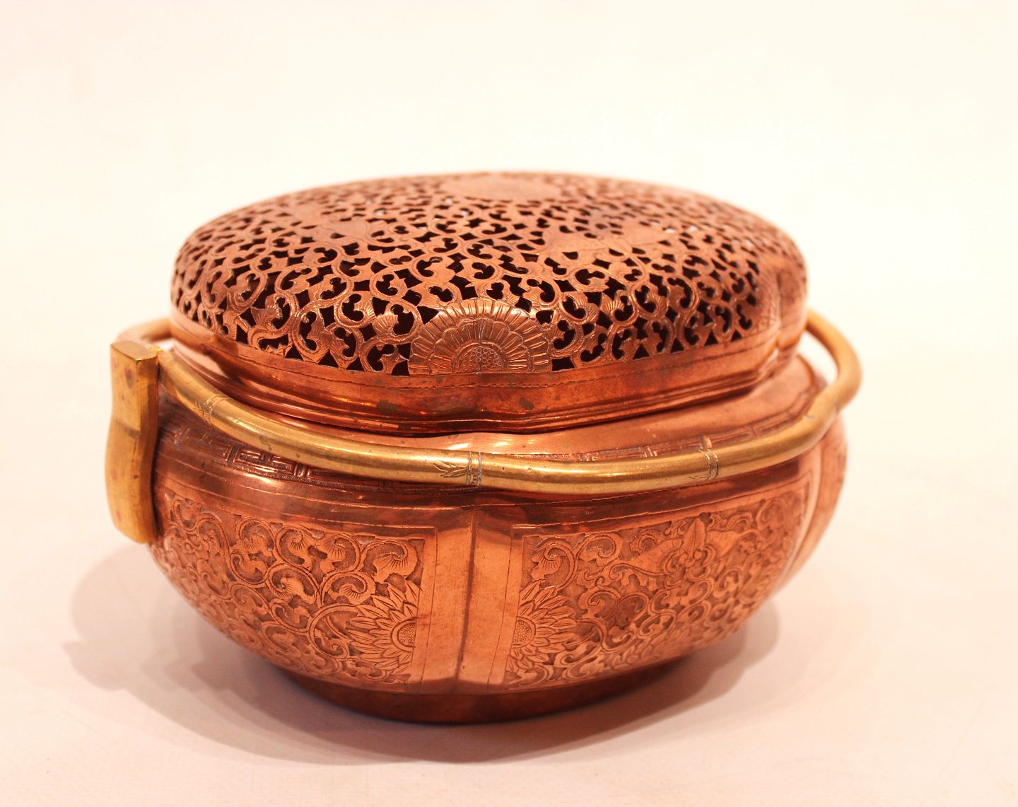 Delicate decorated lidded bowl of copper with handles, in great vintage condition.