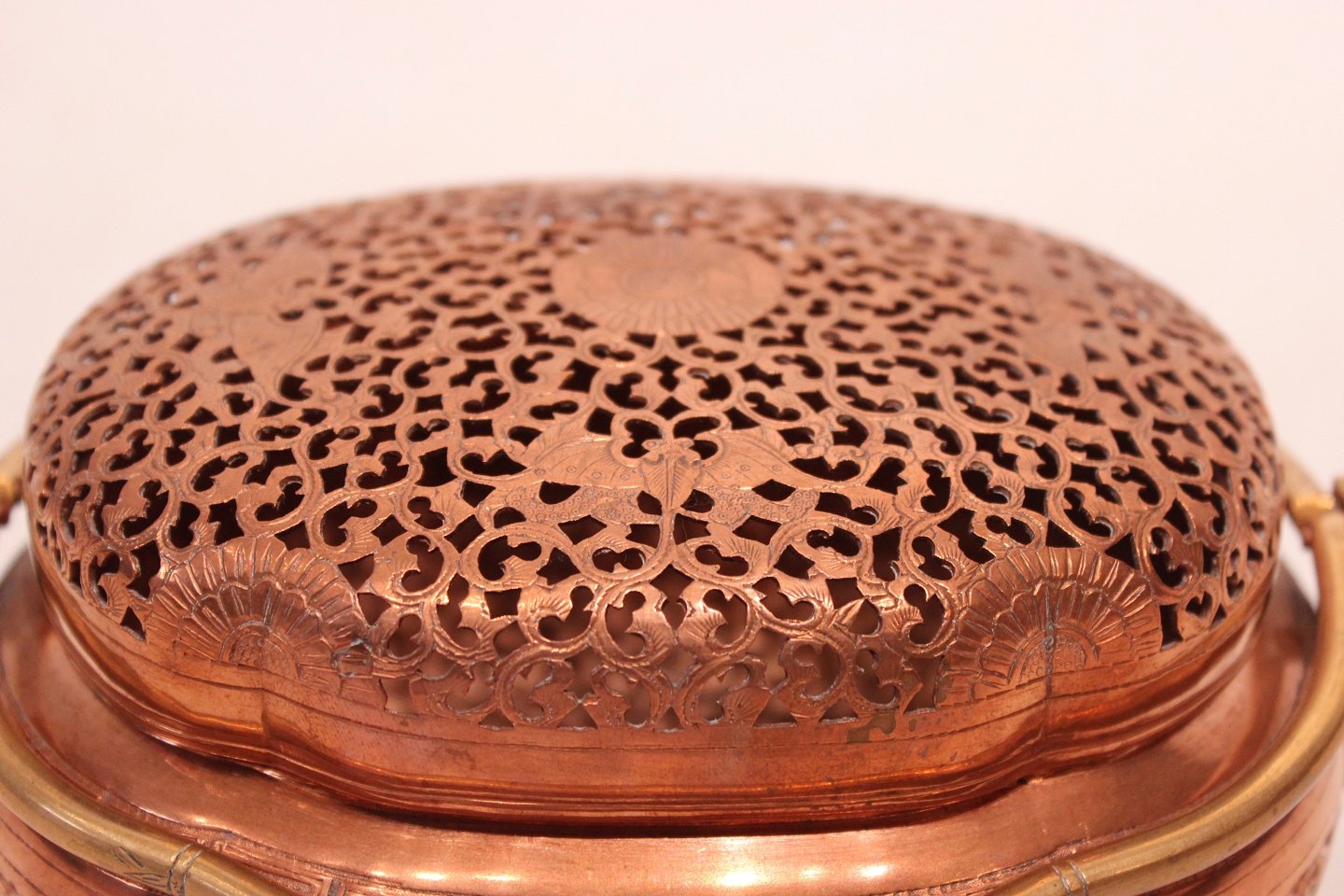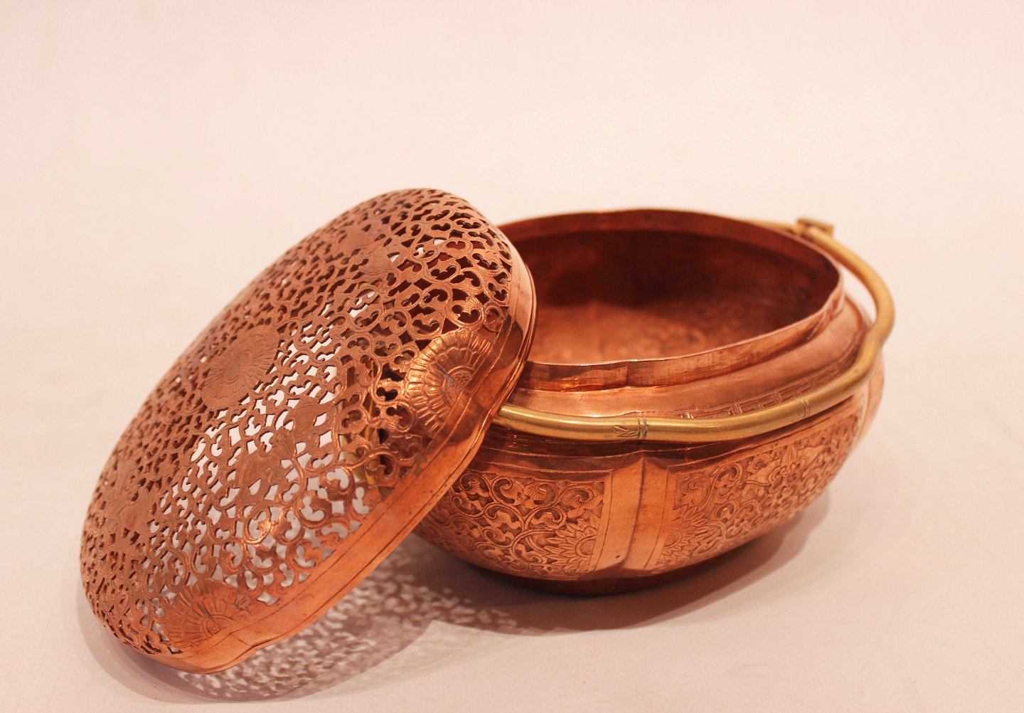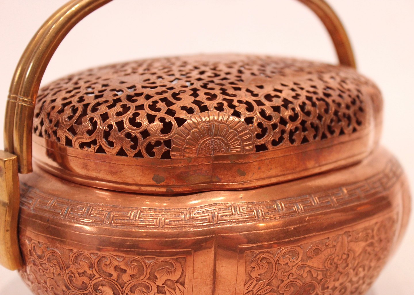Delicate decorated lidded bowl of copper with handles, in great vintage condition.