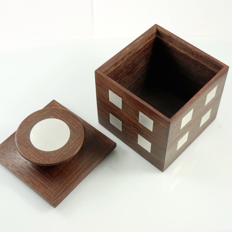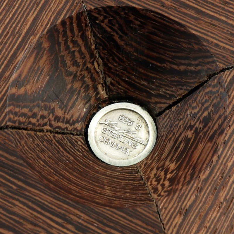Hans Hansen. Æske med låg i moseeg med indlagt sterling sølv. 1960erne