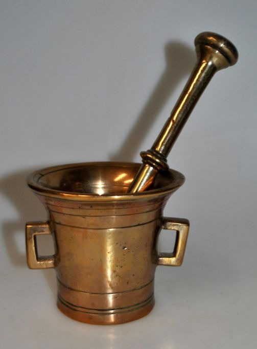 Mindre messing morter med pistil. 19. årh. Danmark.