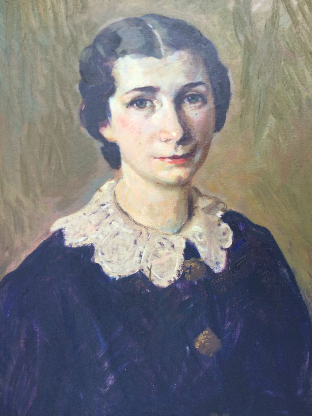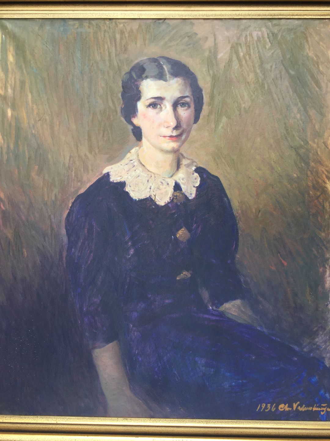 Text available in Danish: Maleri af Christian Valentinussen - Portræt af siddende ung kvinde 1936.