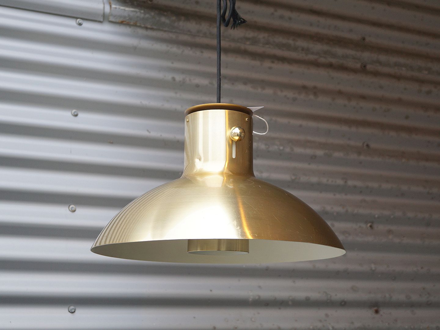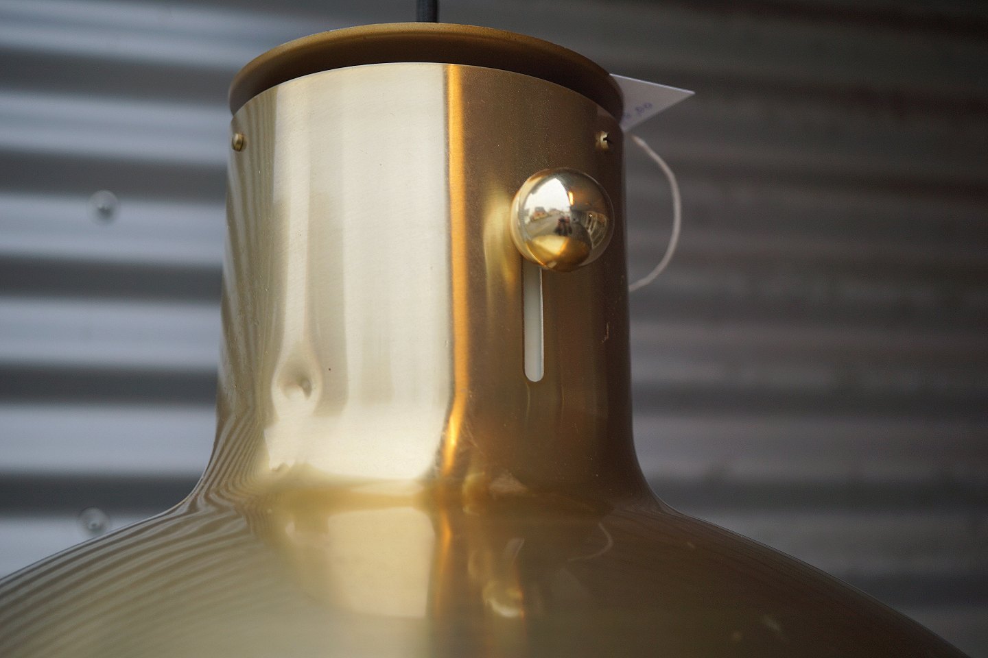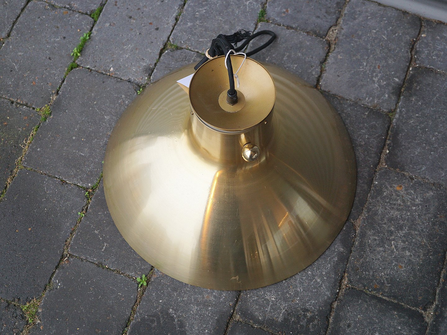Lyfa. Messing pendel, indvendig hvid mat lakeret. Ved hjælp af de 2 skruer, på siderne, kan lyskeglen justeres