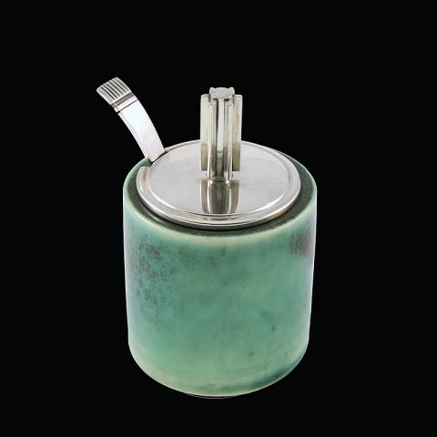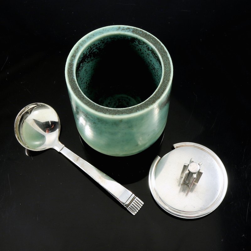 Saxbo - F. Hingelberg. Stoneware Jar with Sterling Silver Lid and Spoon.
