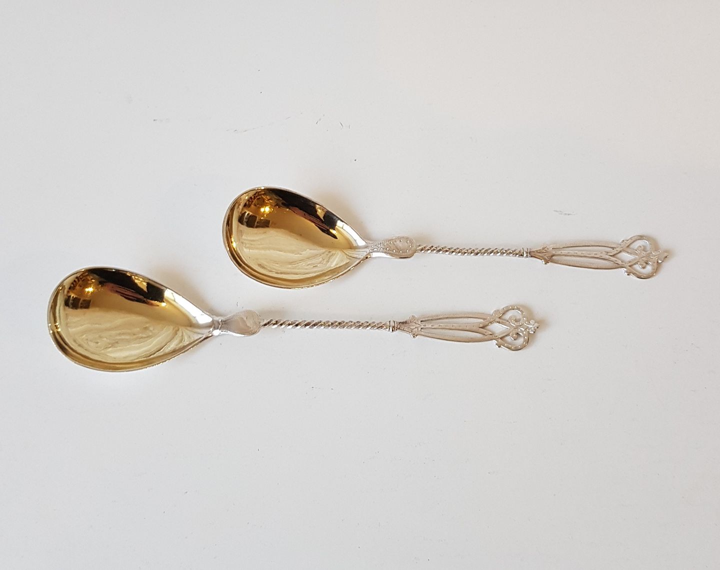 Par marmeladeskeer i sølv fra 1879 Nygotisk stil.